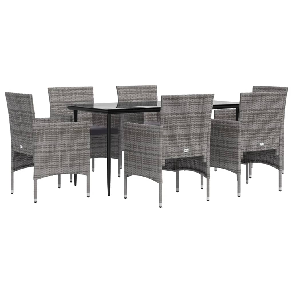 Mit ihrem eleganten und modernen Design ist diese Garten-Essgruppe eine großartige Wahl für Mahlzeiten oder zum Entspannen im Garten. Witterungsbeständiges Material: Aus witterungsbeständigem und wasserabweisendem PE-Rattan gefertigt, ist diese Garten-Essgruppe leicht zu reinigen, strapazierfähig und für den täglichen Gebrauch geeignet.Stabiler Rahmen: Dank der pulverbeschichteten Stahlrahmen ist die Outdoor-Essgruppe robust, stabil und für den täglichen Einsatz im Außenbereich bestens geeignet.Praktische Tischplatte: Die glatte Tischplatte des Esstisches besteht aus Hartglas, das sich leicht mit einem feuchten Tuch reinigen lässt. Zudem bietet die robuste Tischplatte den perfekten Platz für Speisen, Getränke und einige Dekoartikel.Komfortables Design: Mit geschwungenen Rückenlehnen und Armlehnen versehen, bieten diese Gartenstühle höchsten Komfort.Zusätzlicher Komfort: Die dick gepolsterten Kissen sorgen für höchsten Sitzkomfort in deiner Freizeit. Hinweis:Um die Lebensdauer deiner Gartenmöbel zu verlängern, empfehlen wir dir, sie mit einer wasserdichten Hülle zu schützen.Jedes Produkt wird mit einer Montageanleitung in der Verpackung für einen einfachen Zusammenbau geliefert.