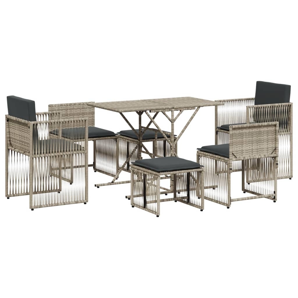 Diese Garten-Essgruppe ist eine ideale Wahl für Mahlzeiten im Freien oder einfach nur zum Entspannen im Garten, Hinterhof oder auf der Terrasse. Langlebiges Material: PE-Rattan, auch als Poly Rattan bekannt, ist ein robustes, pflegeleichtes synthetisches Material, das die Optik von natürlichem Rattan aufweist. Es kennzeichnet sich durch ein geringes Eigengewicht und lässt sich einfach reinigen. Aufgrund seiner Haltbarkeit und Witterungsbeständigkeit wird es häufig bei der Herstellung von Gartenmöbeln verwendet.Kompakte Aufbewahrung: Die Gartenstühle und Hocker können platzsparend unter dem Tisch aufbewahrt werden.Bequemes Sitzerlebnis: Dieser Gartensessel mit dick gepolsterten Kissen bietet ein angenehmes Sitzgefühl.Abnehmbarer und waschbarer Bezug: Diese Sitzkissen verfügen über abnehmbare Bezüge für einfaches Waschen und Pflegen.Robuster und stabiler Rahmen: Dank des pulverbeschichteten Stahlrahmens ist das Möbelstück robust, stabil und für den täglichen Einsatz im Außenbereich geeignet. Gut zu wissen: Wir empfehlen dir, deine Gartenmöbel mit einer wasserdichten Hülle zu schützen, um lange Zeit eine ansprechende Optik aufzuweisen.