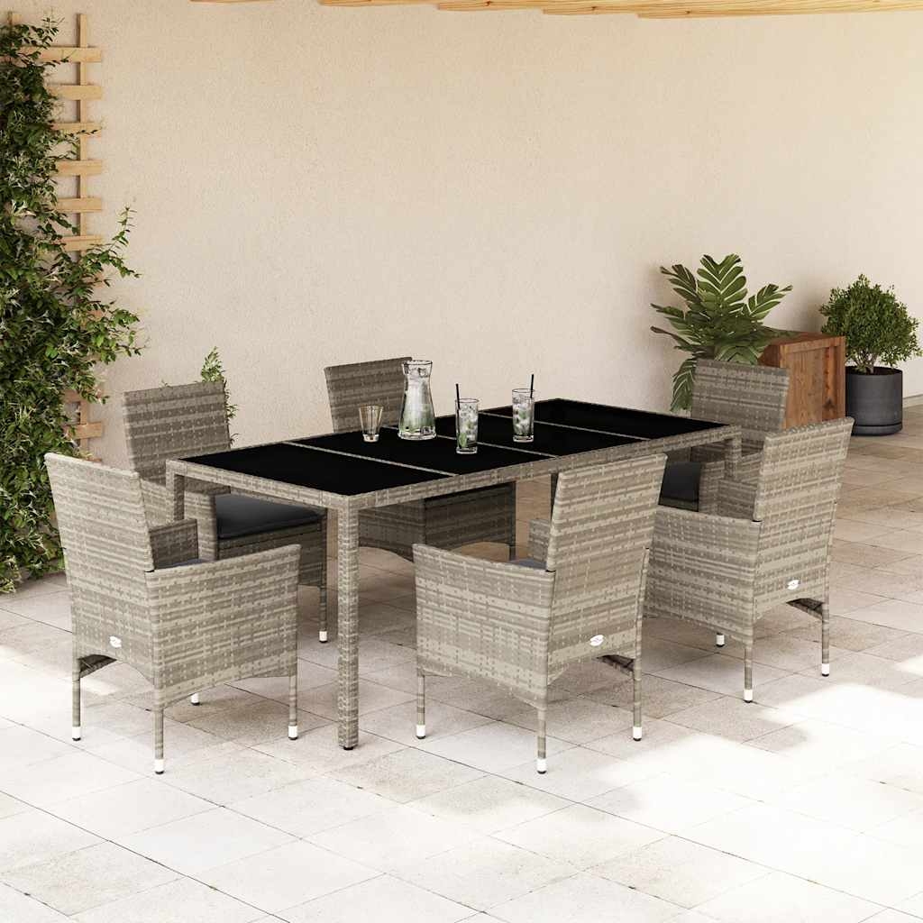 Diese Garten-Essgruppe ist eine ideale Wahl für Mahlzeiten im Freien oder einfach nur zum Entspannen im Garten, Hinterhof oder auf der Terrasse. Langlebiges Material: PE-Rattan, auch als Poly Rattan bekannt, ist ein robustes, pflegeleichtes synthetisches Material, das die Optik von natürlichem Rattan aufweist. Es kennzeichnet sich durch ein geringes Eigengewicht und lässt sich einfach reinigen. Aufgrund seiner Haltbarkeit und Witterungsbeständigkeit wird es häufig bei der Herstellung von Gartenmöbeln verwendet.Bequemes Sitzerlebnis: Dieses Gartenmöbel-Set wird samt dick gepolsterten Kissen geliefert, um höchsten Sitzkomfort zu bieten.Abnehmbarer und waschbarer Bezug: Diese Sitzkissen verfügen über abnehmbare Bezüge für einfaches Waschen und Pflegen.Tischplatte aus Glas: Die Tischplatte des Gartentisches besteht aus starkem und langlebigem Hartglas, sodass sie leicht mit einem feuchten Tuch gereinigt werden kann und deinem Außenbereich einen Hauch von Eleganz verleiht. Gut zu wissen:Wir empfehlen dir, deine Gartenmöbel mit einer wasserdichten Hülle zu schützen, um lange Zeit eine ansprechende Optik aufzuweisen.