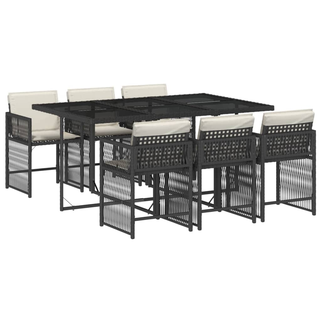 Diese Garten-Essgruppe ist eine ideale Wahl für Mahlzeiten im Freien oder einfach nur zum Entspannen im Garten, Hinterhof oder auf der Terrasse. Langlebiges Material: PE-Rattan, auch als Poly Rattan bekannt, ist ein robustes, pflegeleichtes synthetisches Material, das die Optik von natürlichem Rattan aufweist. Es kennzeichnet sich durch ein geringes Eigengewicht und lässt sich einfach reinigen. Aufgrund seiner Haltbarkeit und Witterungsbeständigkeit wird es häufig bei der Herstellung von Gartenmöbeln verwendet.Platzsparende Aufbewahrung: Dank der klappbaren Rückenlehnen lassen sich die Stühle unter dem Tisch verstauen, sodass die gesamte Essgruppe bei Nichtgebrauch eine platzsparende Würfelform bildet.Bequemes Sitzerlebnis: Dieser Gartensessel mit dick gepolsterten Kissen bietet ein angenehmes Sitzgefühl.Abnehmbarer und waschbarer Bezug: Die Sitzkissen verfügen über abnehmbare Bezüge, die sich ganz einfach waschen und reinigen lassen. Dank der Klappen an der Rückseite können die Kissen ganz einfach an den Rückenlehnen befestigt werden.Tischplatte aus Glas: Die Tischplatte des Gartentisches besteht aus starkem und langlebigem Hartglas, sodass sie leicht mit einem feuchten Tuch gereinigt werden kann und deinem Außenbereich einen Hauch von Eleganz verleiht. Gut zu wissen:Wir empfehlen dir, deine Gartenmöbel mit einer wasserdichten Hülle zu schützen, um lange Zeit eine ansprechende Optik aufzuweisen.