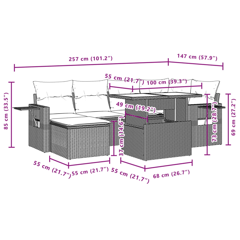 Diese Garten-Sofagarnitur ist die perfekte Ergänzung zu deinem Garten, deiner Terrasse oder deinem Innenhof. Sie bietet einen bequemen und einladenden Platz, um mit Familie und Freunden zu plaudern oder dich einfach nur zu entspannen und das Leben im Freien zu genießen. Langlebiges Material: PE-Rattan, auch als Poly Rattan bekannt, ist ein robustes, pflegeleichtes synthetisches Material, das die Optik von natürlichem Rattan aufweist. Es kennzeichnet sich durch ein geringes Eigengewicht und lässt sich einfach reinigen. Aufgrund seiner Haltbarkeit und Witterungsbeständigkeit wird es häufig bei der Herstellung von Gartenmöbeln verwendet.Verstellbare Tischplatte: Die Tischplatte lässt sich anheben, um den Gartentisch höher zu machen und ihn von einem Couchtisch in einen Esstisch zu verwandeln. Er eignet sich daher perfekt für Gäste oder Mahlzeiten im Freien.Praktischer Beistelltisch: Diese Gartengarnitur verfügt über klappbare Ablagen mit Gasfedern an den Armlehnen, auf denen du verschiedene Sachen griffbereit aufbewahren kannst. Bequemes Sitzerlebnis: Dieser Gartensessel mit dick gepolsterten Kissen bietet ein angenehmes Sitzgefühl.Modulares Design: Dank des modularen Designs lassen sich die Gartenmöbel völlig flexibel und einfach umstellen, um deinen Außenbereich ganz individuell zu gestalten. Gut zu wissen:Wir empfehlen dir, deine Gartenmöbel mit einer wasserdichten Hülle zu schützen, um lange Zeit eine ansprechende Optik aufzuweisen.