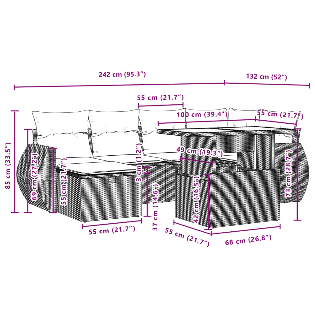 Diese Garten-Sofagarnitur ist die perfekte Ergänzung zu deinem Garten, deiner Terrasse oder deinem Innenhof. Sie bietet einen bequemen und einladenden Platz, um mit Familie und Freunden zu plaudern oder dich einfach nur zu entspannen und das Leben im Freien zu genießen. Langlebiges Material: PE-Rattan, auch als Poly Rattan bekannt, ist ein robustes, pflegeleichtes synthetisches Material, das die Optik von natürlichem Rattan aufweist. Es kennzeichnet sich durch ein geringes Eigengewicht und lässt sich einfach reinigen. Aufgrund seiner Haltbarkeit und Witterungsbeständigkeit wird es häufig bei der Herstellung von Gartenmöbeln verwendet.Verstellbare Tischplatte: Die Tischplatte lässt sich anheben, um den Gartentisch höher zu machen und ihn von einem Couchtisch in einen Esstisch zu verwandeln. Der Tisch eignet sich daher perfekt für Gäste oder Mahlzeiten im Freien.Tischplatte aus Glas: Die Tischplatte des Gartentisches besteht aus starkem und langlebigem Hartglas, sodass sie leicht mit einem feuchten Tuch gereinigt werden kann und deinem Außenbereich einen Hauch von Eleganz verleiht.Abnehmbarer und waschbarer Bezug: Diese Sitzkissen verfügen über abnehmbare Bezüge für einfaches Waschen und Pflegen.Modulares Design: Dank des modularen Designs lassen sich die Gartenmöbel völlig flexibel und einfach umstellen, um deinen Außenbereich ganz individuell zu gestalten. Gut zu wissen:Wir empfehlen dir, deine Gartenmöbel mit einer wasserdichten Hülle zu schützen, um lange Zeit eine ansprechende Optik aufzuweisen.