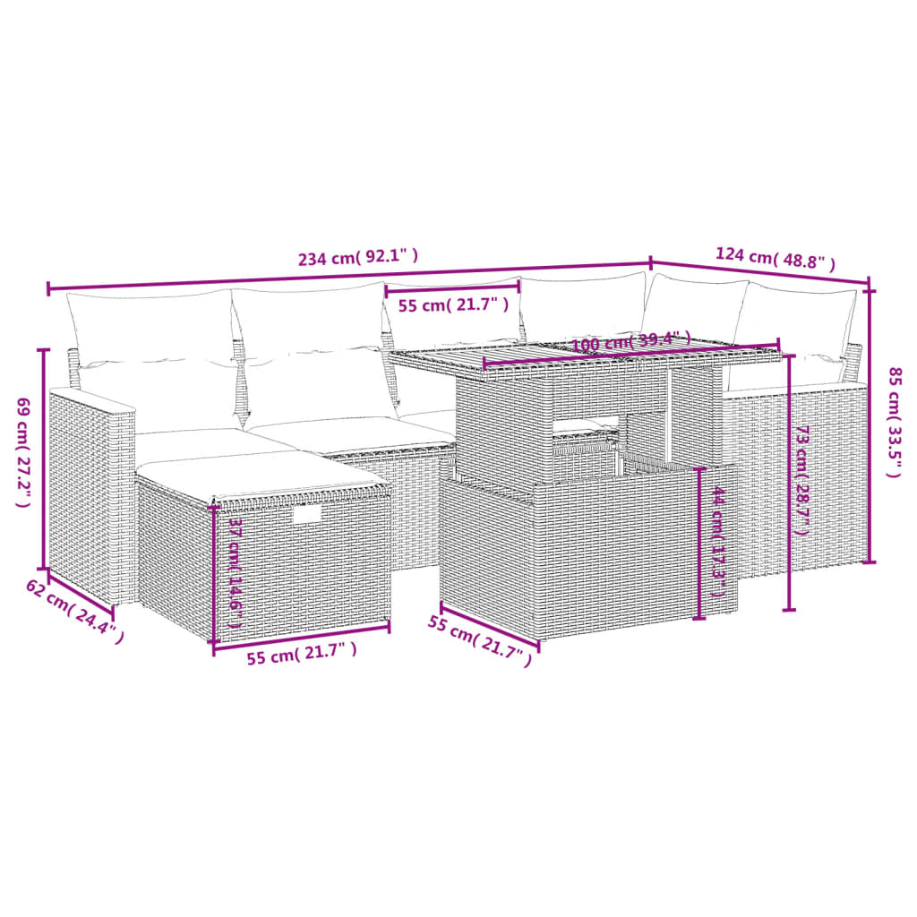 Diese Garten-Sofagarnitur ist die perfekte Ergänzung zu deinem Garten, deiner Terrasse oder deinem Innenhof. Sie bietet einen bequemen und einladenden Platz, um mit Familie und Freunden zu plaudern oder dich einfach nur zu entspannen und das Leben im Freien zu genießen. Langlebiges Material: PE-Rattan, auch als Poly Rattan bekannt, ist ein robustes, pflegeleichtes synthetisches Material, das die Optik von natürlichem Rattan aufweist. Es kennzeichnet sich durch ein geringes Eigengewicht und lässt sich einfach reinigen. Aufgrund seiner Haltbarkeit und Witterungsbeständigkeit wird es häufig bei der Herstellung von Gartenmöbeln verwendet.Verstellbare Tischplatte: Die Tischplatte lässt sich anheben, um den Gartentisch höher zu machen und ihn von einem Couchtisch in einen Esstisch zu verwandeln. Der Tisch eignet sich daher perfekt für Gäste oder Mahlzeiten im Freien.Abnehmbarer und waschbarer Bezug: Diese Sitzkissen verfügen über abnehmbare Bezüge für einfaches Waschen und Pflegen.Modulares Design: Dank des modularen Designs lassen sich die Gartenmöbel völlig flexibel und einfach umstellen, um deinen Außenbereich ganz individuell zu gestalten. Gut zu wissen:Wir empfehlen dir, deine Gartenmöbel mit einer wasserdichten Hülle zu schützen, um lange Zeit eine ansprechende Optik aufzuweisen.