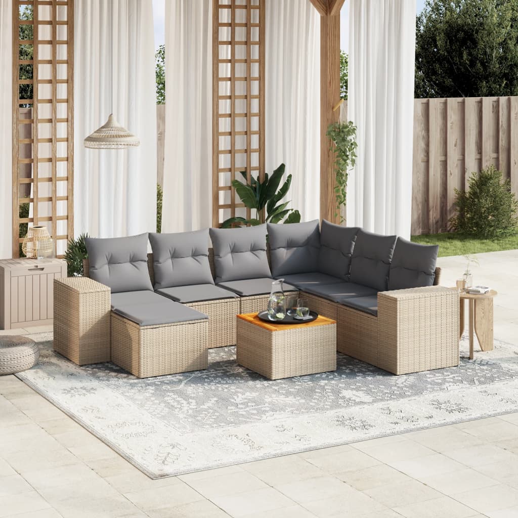 Diese Garten-Sofagarnitur ist die perfekte Ergänzung zu deinem Garten, deiner Terrasse oder deinem Innenhof. Sie bietet einen bequemen und einladenden Platz, um mit Familie und Freunden zu plaudern oder dich einfach nur zu entspannen und das Leben im Freien zu genießen. Langlebiges Material: PE-Rattan, auch als Poly Rattan bekannt, ist ein robustes, pflegeleichtes synthetisches Material, das die Optik von natürlichem Rattan aufweist. Es kennzeichnet sich durch ein geringes Eigengewicht und lässt sich einfach reinigen. Aufgrund seiner Haltbarkeit und Witterungsbeständigkeit wird es häufig bei der Herstellung von Gartenmöbeln verwendet.Stabile und pflegeleichte Tischplatte: Dieser Gartentisch besitzt eine Tischplatte aus Akazienholz, die robust und langlebig ist und sich leicht mit einem feuchten Tuch reinigen lässt. Bequemes Sitzerlebnis: Dieser Gartensessel mit dick gepolsterten Kissen bietet ein angenehmes Sitzgefühl.Abnehmbarer und waschbarer Bezug: Diese Sitzkissen verfügen über abnehmbare Bezüge für einfaches Waschen und Pflegen.Modulares Design: Dank des modularen Designs lassen sich die Gartenmöbel völlig flexibel und einfach umstellen, um deinen Außenbereich ganz individuell zu gestalten. Gut zu wissen:Wir empfehlen dir, deine Gartenmöbel mit einer wasserdichten Hülle zu schützen, um lange Zeit eine ansprechende Optik aufzuweisen.