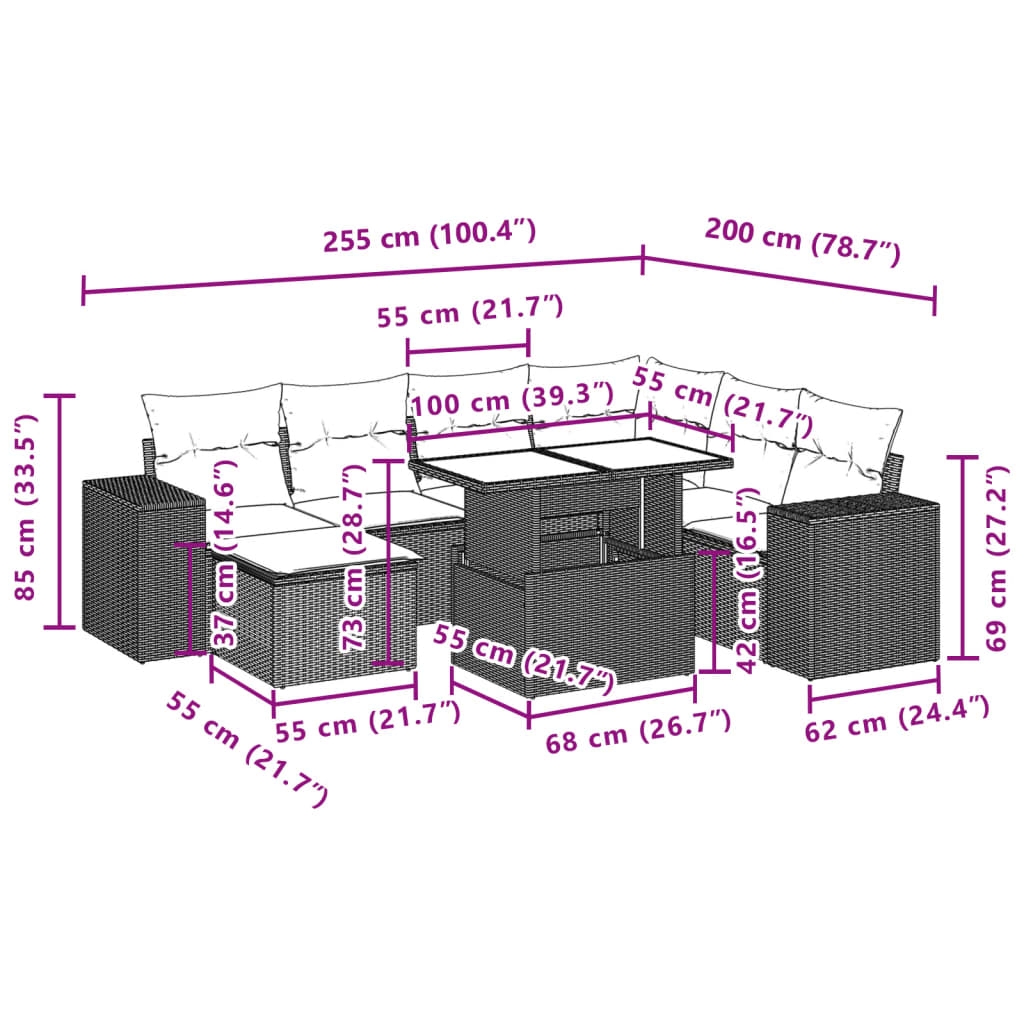 Diese Garten-Sofagarnitur ist die perfekte Ergänzung zu deinem Garten, deiner Terrasse oder deinem Innenhof. Sie bietet einen bequemen und einladenden Platz, um mit Familie und Freunden zu plaudern oder dich einfach nur zu entspannen und das Leben im Freien zu genießen. Langlebiges Material: PE-Rattan, auch als Poly Rattan bekannt, ist ein robustes, pflegeleichtes synthetisches Material, das die Optik von natürlichem Rattan aufweist. Es kennzeichnet sich durch ein geringes Eigengewicht und lässt sich einfach reinigen. Aufgrund seiner Haltbarkeit und Witterungsbeständigkeit wird es häufig bei der Herstellung von Gartenmöbeln verwendet.Verstellbare Tischplatte: Die Tischplatte lässt sich anheben, um den Gartentisch höher zu machen und ihn von einem Couchtisch in einen Esstisch zu verwandeln. Er eignet sich daher perfekt für Gäste oder Mahlzeiten im Freien.Bequemes Sitzerlebnis: Dieser Gartensessel mit dick gepolsterten Kissen bietet ein angenehmes Sitzgefühl.Abnehmbarer und waschbarer Bezug: Diese Sitzkissen verfügen über abnehmbare Bezüge für einfaches Waschen und Pflegen.Modulares Design: Dank des modularen Designs lassen sich die Gartenmöbel völlig flexibel und einfach umstellen, um deinen Außenbereich ganz individuell zu gestalten. Gut zu wissen:Wir empfehlen dir, deine Gartenmöbel mit einer wasserdichten Hülle zu schützen, um lange Zeit eine ansprechende Optik aufzuweisen.