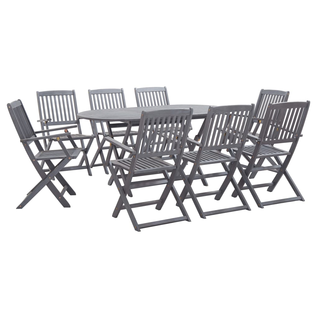 Dieses stilvolle und moderne Gartenmöbel-Set besteht aus 1 ovalen Tisch und 4 klappbaren Stühlen und wird jeder Mahlzeit eine luxuriöse Note verleihen.// Sowohl der Tisch als auch die Stühle sind aus massivem Akazienholz mit grauer Lackierung gefertigt. Daher sind sie witterungsbeständig, langlebig und lassen sich mit einem feuchten Tuch leicht reinigen. Aufgrund der stabilen Holzstruktur ist dieses Set sehr stabil und sicher. Darüber hinaus bietet es Ihnen Komfort und Bequemlichkeit, um wertvolle Zeit mit Familie und Freunden zu verbringen. Des Weiteren lassen sich Tisch und Stühle leicht zusammenklappen, was bei Nichtgebrauch eine einfache Lagerung und Transport ermöglicht. Lieferumfang 1 oval Esstisch und 8 Klappstühle.