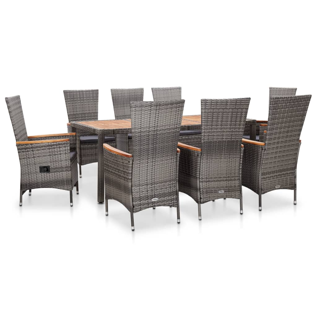 Diese stilvolle Poly Rattan Essgruppe wird der Hingucker in Ihrem Garten oder auf Ihrer Terrasse sein! Diese Essgruppe aus Rattan besticht durch sein elegantes, modernes Design eignet sich hervorragend für Ihre Mahlzeiten im Freien oder einfach zum Entspannen im Garten. Aus wetter- und wasserabweisendem PE-Rattan gefertigt, ist die Essgruppe leicht zu reinigen, strapazierfähig und für den täglichen Gebrauch geeignet. Die pulverbeschichteten Stahlrahmen verleihen dem Tisch und den Stühlen Stabilität und Robustheit. Die Tischplatte und die Armlehnen bestehen aus Akazienholz, einem tropischen Hartholz, das einen rustikalen Charme verleiht. Zwei der acht Stühle verfügen über verstellbare Rückenlehnen. Durch Berühren der Taste an der Seite neigt sich die Rückenlehne nach hinten. Dank der Leichtbauweise sind die Möbelstücke einfach zu bewegen. Die dicken und weichen, mit Schaumstoff gefüllten Sitzkissen sind äußerst komfortabel und mit wasserabweisendem Polyester bezogen. Die Polsterbezüge mit Reißverschlüssen können leicht entfernt und gewaschen werden. Dieses Gartenmöbelset beinhaltet 1 Tisch, 8 Hochlehner Gartenstühle und 8 Kissen. Hinweis: Wir empfehlen, das Set bei Regen, Schnee und Frost abzudecken.