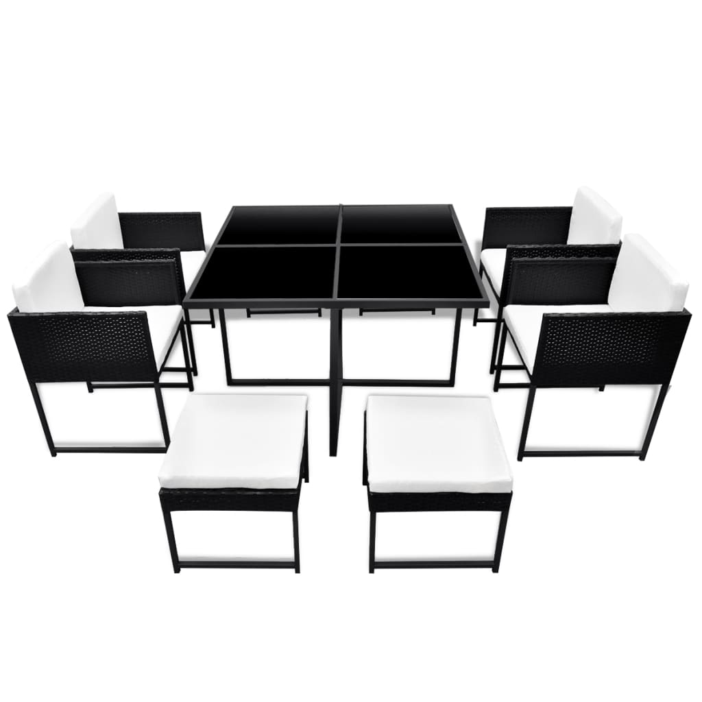 Diese Garten-Essgruppe für 8 Personen aus Rattan verfügt über ein elegantes Design und besteht aus 1 Tisch, 4 Stühlen und 4 Hockern. Dieses Gartenmöbel-Set aus Rattan wird der Mittelpunkt Ihres Gartens oder Ihrer Terrasse sein! Die pulverbeschichteten Stahlrahmen führen dazu, dass Tisch und Stühle stabil und langlebig sind. Dank seiner leichten Bauweise kann das Set leicht umgestellt werden. Aufgrund des wetterfesten PE-Rattans ist dieses Set einfach zu reinigen. Die gehärtete Glasscheibe des Tisches kann ebenfalls leicht mit einem feuchten Tuch gereinigt werden. Die dicken Polster mit der Baumwollfasterfüllung sind sehr komfortabel und aus Polyester hergestellt worden. Die abziehbaren und waschbaren Sitzkissen sind mit Reißverschlüssen versehen. Die Hocker können mit Leichtigkeit unter den Tisch gestellt werden, um Platz zu sparen, wenn sie nicht gebraucht werden. Lieferumfang: 1 Tisch mit Glasplatte, 4 Rattanstühle, 4 Hocker, 8 Sitzkissen und 4 Rückenkissen. Hinweis: Wir empfehlen, das Set bei Regen, Schnee und Frost abzudecken.