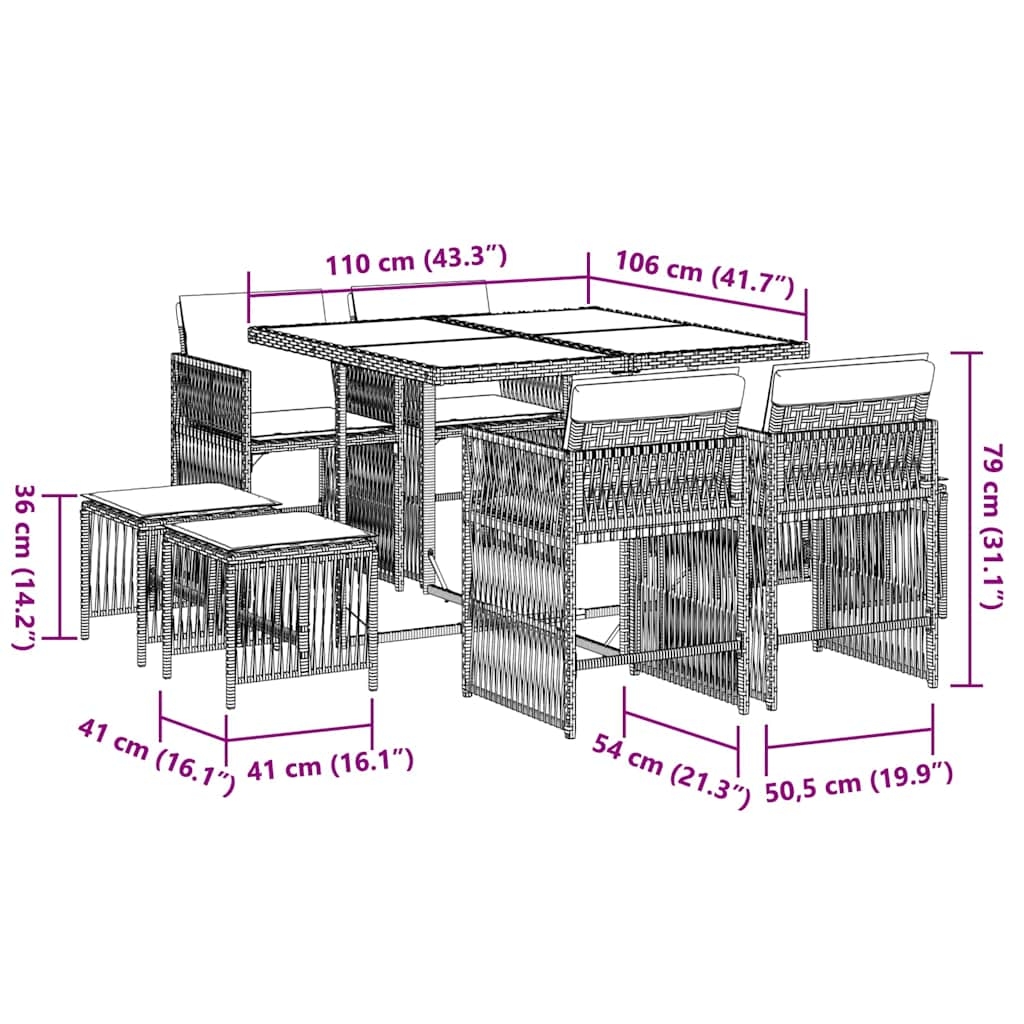 Diese Garten-Essgruppe ist eine ideale Wahl für Mahlzeiten im Freien oder einfach nur zum Entspannen im Garten, Hinterhof oder auf der Terrasse. Langlebiges Material: PE-Rattan, auch als Poly Rattan bekannt, ist ein robustes, pflegeleichtes synthetisches Material, das die Optik von natürlichem Rattan aufweist. Es kennzeichnet sich durch ein geringes Eigengewicht und lässt sich einfach reinigen. Aufgrund seiner Haltbarkeit und Witterungsbeständigkeit wird es häufig bei der Herstellung von Gartenmöbeln verwendet.Platzsparende Aufbewahrung: Dank der klappbaren Rückenlehnen lassen sich die Stühle unter dem Tisch verstauen, sodass die gesamte Essgruppe bei Nichtgebrauch eine platzsparende Würfelform bildet.Bequemes Sitzerlebnis: Dieser Gartensessel mit dick gepolsterten Kissen bietet ein angenehmes Sitzgefühl.Abnehmbarer und waschbarer Bezug: Die Sitzkissen verfügen über abnehmbare Bezüge, die sich ganz einfach waschen und reinigen lassen. Dank der Klappen an der Rückseite können die Kissen ganz einfach an den Rückenlehnen befestigt werden.Tischplatte aus Glas: Die Tischplatte des Gartentisches besteht aus starkem und langlebigem Hartglas, sodass sie leicht mit einem feuchten Tuch gereinigt werden kann und deinem Außenbereich einen Hauch von Eleganz verleiht. Gut zu wissen:Wir empfehlen dir, deine Gartenmöbel mit einer wasserdichten Hülle zu schützen, um lange Zeit eine ansprechende Optik aufzuweisen.