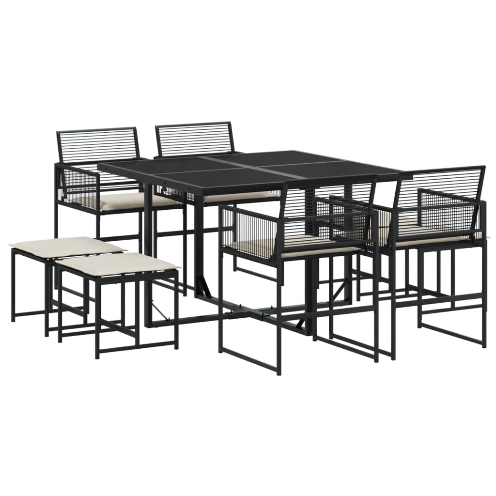 Diese Garten-Essgruppe ist eine ideale Wahl für Mahlzeiten im Freien oder einfach nur zum Entspannen im Garten, Hinterhof oder auf der Terrasse. Langlebiges Material: PE-Rattan, auch als Poly Rattan bekannt, ist ein robustes, pflegeleichtes synthetisches Material, das die Optik von natürlichem Rattan aufweist. Es kennzeichnet sich durch ein geringes Eigengewicht und lässt sich einfach reinigen. Aufgrund seiner Haltbarkeit und Witterungsbeständigkeit wird es häufig bei der Herstellung von Gartenmöbeln verwendet. Tischplatte aus Glas: Die Tischplatte des Gartentisches besteht aus starkem und langlebigem Hartglas, sodass sie leicht mit einem feuchten Tuch gereinigt werden kann und deinem Außenbereich einen Hauch von Eleganz verleiht. Platzsparende Aufbewahrung: Dank der klappbaren Rückenlehne lassen sich die Stühle unter dem Tisch verstauen. Zudem finden auch die Hocker Platz unter den Stühlen, sodass die gesamte Essgruppe bei Nichtgebrauch eine platzsparende Würfelform bildet, um deinen verfügbaren Platz optimal auszunutzen. Bequemes Sitzerlebnis: Dieser Gartensessel mit dick gepolsterten Kissen bietet ein angenehmes Sitzgefühl. Gut zu wissen:Wir empfehlen dir, deine Gartenmöbel mit einer wasserdichten Hülle zu schützen, um lange Zeit eine ansprechende Optik aufzuweisen.