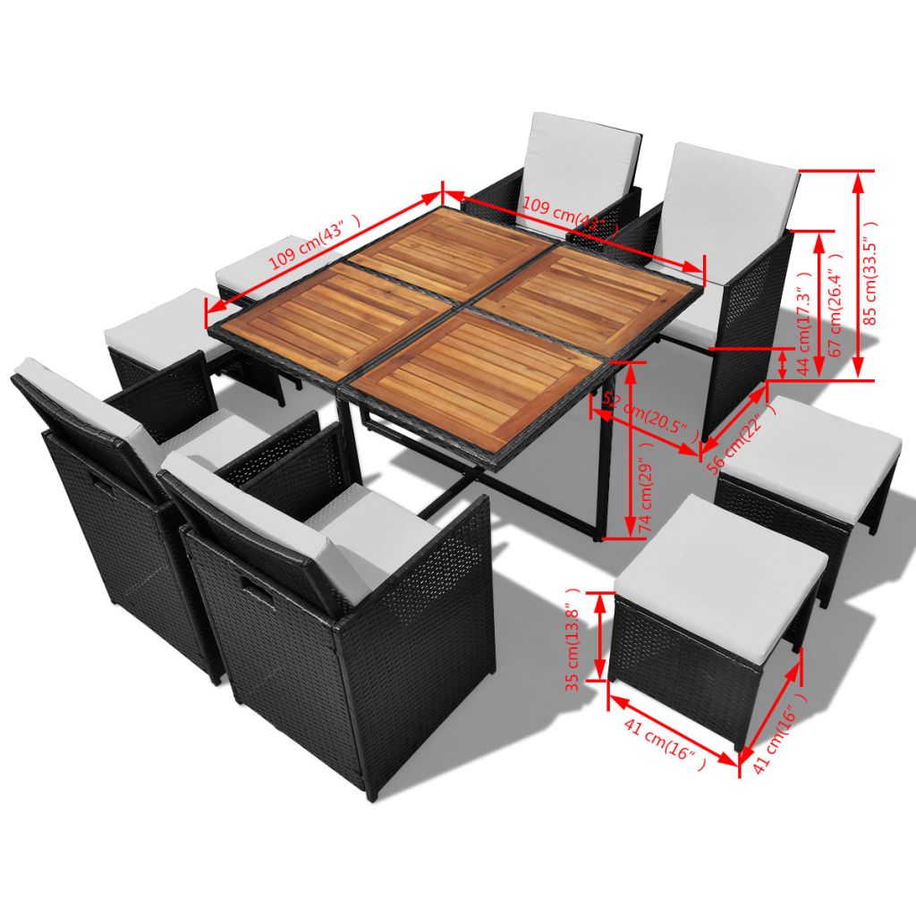 Diese stilvolle Rattan-Essgruppe wird der Hingucker in Ihrem Garten oder auf Ihrer Terrasse sein! Diese Rattan-Essgruppe mit elegantem Design ist eine fabelhafte Wahl für Mahlzeiten im Freien oder einfach nur zum Entspannen im Garten. Die pulverbeschichteten Stahlrahmen sorgen dafür, dass der Tisch, die Stühle und die Hocker stabil, robust und langlebig sind. Dank ihrer leichten Konstruktion sind alle Teile dennoch einfach zu bewegen. Durch das wetterbeständige und wasserdichte PE-Rattan kann die Essgruppe einfach sauber gehalten werden. Die Tischplatte aus Akazien-Massivholz lässt sich einfach mit einem feuchten Tuch reinigen. Die dick gepolsterten, weichen Sitz- und Rückenpolster mit Schaumstoff-Füllung sind sehr komfortabel. Die aus wasserabweisendem Polyester gefertigten Bezüge sind mit Reißverschlüssen versehen, damit sie abgenommen und gewaschen werden können. Die Lieferung beinhaltet 1 Tisch, 4 Stühle, 4 Hocker und 12 Kissen. Hinweis: Wir empfehlen, das Set im Regen, Schnee und Frost zu bedecken.