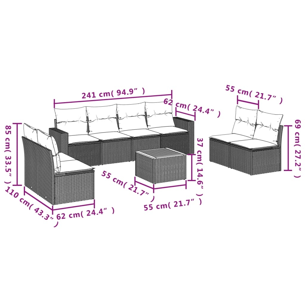 Diese Garten-Sofagarnitur ist die perfekte Ergänzung zu deinem Garten, deiner Terrasse oder deinem Innenhof. Sie bietet einen bequemen und einladenden Platz, um mit Familie und Freunden zu plaudern oder dich einfach nur zu entspannen und das Leben im Freien zu genießen. Langlebiges Material: PE-Rattan, auch als Poly Rattan bekannt, ist ein robustes, pflegeleichtes synthetisches Material, das die Optik von natürlichem Rattan aufweist. Es kennzeichnet sich durch ein geringes Eigengewicht und lässt sich einfach reinigen. Aufgrund seiner Haltbarkeit und Witterungsbeständigkeit wird es häufig bei der Herstellung von Gartenmöbeln verwendet.Bequemes Sitzerlebnis: Dieser Gartensessel mit dick gepolsterten Kissen bietet ein angenehmes Sitzgefühl.Stabile und pflegeleichte Tischplatte: Dieser Gartentisch besitzt eine Tischplatte aus Akazienholz, die robust und langlebig ist und sich leicht mit einem feuchten Tuch reinigen lässt.Abnehmbarer und waschbarer Bezug: Diese Sitzkissen verfügen über abnehmbare Bezüge für einfaches Waschen und Pflegen.Modulares Design: Dank des modularen Designs lassen sich die Gartenmöbel völlig flexibel und einfach umstellen, um deinen Außenbereich ganz individuell zu gestalten. Gut zu wissen:Wir empfehlen dir, deine Gartenmöbel mit einer wasserdichten Hülle zu schützen, um lange Zeit eine ansprechende Optik aufzuweisen.