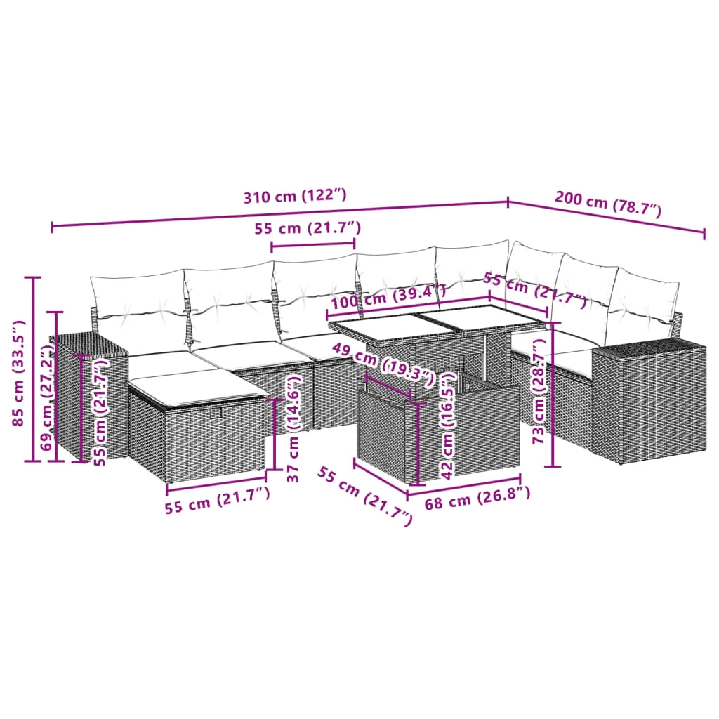 Diese Garten-Sofagarnitur ist die perfekte Ergänzung zu deinem Garten, deiner Terrasse oder deinem Innenhof. Sie bietet einen bequemen und einladenden Platz, um mit Familie und Freunden zu plaudern oder dich einfach nur zu entspannen und das Leben im Freien zu genießen. Langlebiges Material: PE-Rattan, auch als Poly Rattan bekannt, ist ein robustes, pflegeleichtes synthetisches Material, das die Optik von natürlichem Rattan aufweist. Es kennzeichnet sich durch ein geringes Eigengewicht und lässt sich einfach reinigen. Aufgrund seiner Haltbarkeit und Witterungsbeständigkeit wird es häufig bei der Herstellung von Gartenmöbeln verwendet.Verstellbare Tischplatte: Die Tischplatte lässt sich anheben, um den Gartentisch höher zu machen und ihn von einem Couchtisch in einen Esstisch zu verwandeln. Der Tisch eignet sich daher perfekt für Gäste oder Mahlzeiten im Freien.Tischplatte aus Glas: Die Tischplatte des Gartentisches besteht aus starkem und langlebigem Hartglas, sodass sie leicht mit einem feuchten Tuch gereinigt werden kann und deinem Außenbereich einen Hauch von Eleganz verleiht.Abnehmbarer und waschbarer Bezug: Diese Sitzkissen verfügen über abnehmbare Bezüge für einfaches Waschen und Pflegen.Modulares Design: Dank des modularen Designs lassen sich die Gartenmöbel völlig flexibel und einfach umstellen, um deinen Außenbereich ganz individuell zu gestalten. Gut zu wissen:Wir empfehlen dir, deine Gartenmöbel mit einer wasserdichten Hülle zu schützen, um lange Zeit eine ansprechende Optik aufzuweisen.