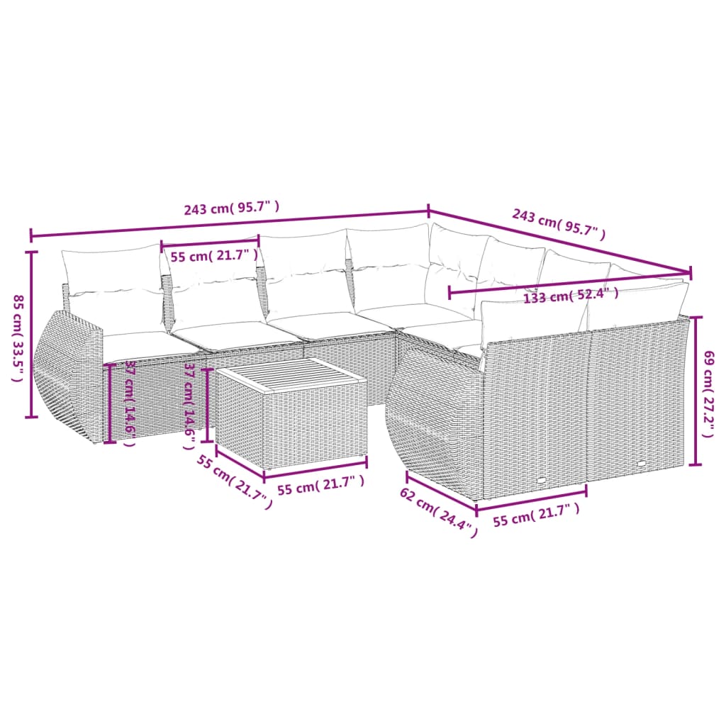 Diese Garten-Sofagarnitur ist die perfekte Ergänzung zu deinem Garten, deiner Terrasse oder deinem Innenhof. Sie bietet einen bequemen und einladenden Platz, um mit Familie und Freunden zu plaudern oder dich einfach nur zu entspannen und das Leben im Freien zu genießen. Langlebiges Material: PE-Rattan, auch als Poly Rattan bekannt, ist ein robustes, pflegeleichtes synthetisches Material, das die Optik von natürlichem Rattan aufweist. Es kennzeichnet sich durch ein geringes Eigengewicht und lässt sich einfach reinigen. Aufgrund seiner Haltbarkeit und Witterungsbeständigkeit wird es häufig bei der Herstellung von Gartenmöbeln verwendet.Stabile und pflegeleichte Tischplatte: Dieser Gartentisch besitzt eine Tischplatte aus Akazienholz, die robust und langlebig ist und sich leicht mit einem feuchten Tuch reinigen lässt. Bequemes Sitzerlebnis: Dieser Gartensessel mit dick gepolsterten Kissen bietet ein angenehmes Sitzgefühl.Abnehmbarer und waschbarer Bezug: Diese Sitzkissen verfügen über abnehmbare Bezüge für einfaches Waschen und Pflegen.Modulares Design: Dank des modularen Designs lassen sich die Gartenmöbel völlig flexibel und einfach umstellen, um deinen Außenbereich ganz individuell zu gestalten. Gut zu wissen:Wir empfehlen dir, deine Gartenmöbel mit einer wasserdichten Hülle zu schützen, um lange Zeit eine ansprechende Optik aufzuweisen.