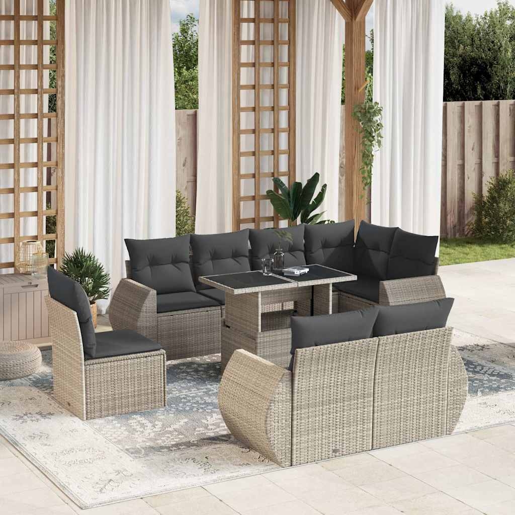 Diese Garten-Sofagarnitur ist die perfekte Ergänzung zu deinem Garten, deiner Terrasse oder deinem Innenhof. Sie bietet einen bequemen und einladenden Platz, um mit Familie und Freunden zu plaudern oder dich einfach nur zu entspannen und das Leben im Freien zu genießen. Langlebiges Material: PE-Rattan, auch als Poly Rattan bekannt, ist ein robustes, pflegeleichtes synthetisches Material, das die Optik von natürlichem Rattan aufweist. Es kennzeichnet sich durch ein geringes Eigengewicht und lässt sich einfach reinigen. Aufgrund seiner Haltbarkeit und Witterungsbeständigkeit wird es häufig bei der Herstellung von Gartenmöbeln verwendet.Verstellbare Tischplatte: Die Tischplatte lässt sich anheben, um den Gartentisch höher zu machen und ihn von einem Couchtisch in einen Esstisch zu verwandeln. Er eignet sich daher perfekt für Gäste oder Mahlzeiten im Freien.Bequemes Sitzerlebnis: Dieser Gartensessel mit dick gepolsterten Kissen bietet ein angenehmes Sitzgefühl.Abnehmbarer und waschbarer Bezug: Diese Sitzkissen verfügen über abnehmbare Bezüge für einfaches Waschen und Pflegen.Modulares Design: Dank des modularen Designs lassen sich die Gartenmöbel völlig flexibel und einfach umstellen, um deinen Außenbereich ganz individuell zu gestalten. Gut zu wissen:Wir empfehlen dir, deine Gartenmöbel mit einer wasserdichten Hülle zu schützen, um lange Zeit eine ansprechende Optik aufzuweisen.