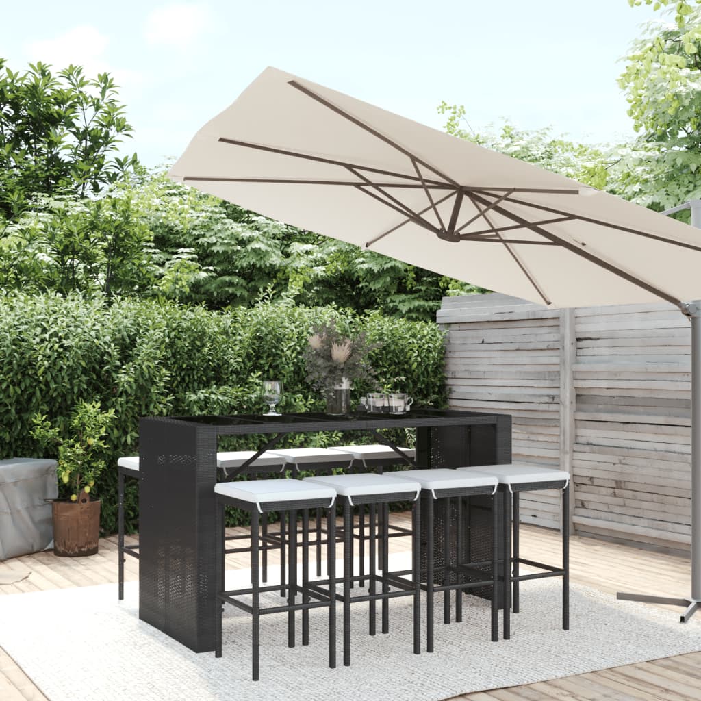 Dieses trendige Gartenbar-Set vereint Stil und Funktionalität und wird ein echter Hingucker in deinem Garten, auf deiner Terrasse oder in jedem anderen Außenbereich sein. Wetterfestes Material: PE-Rattan, auch als Poly Rattan bekannt, ist witterungsbeständig und pflegeleicht. Seine Oberfläche weist lange Zeit eine ansprechende Optik auf. Es bietet hohe Qualität, Komfort und einen ästhetisches Look.Komfortable Sitzgelegenheit: Der Barhocker ist mit integrierter Fußstütze ausgestattet, um es dir bequemlich zu machen. Das dick gepolsterte Sitzkissen sorgt für höchsten Sitzkomfort in deiner Freizeit.Tischplatte aus Hartglas: Die Tischplatte besteht aus Hartglas und lässt sich daher einfach reinigen. Zudem bietet sie Platz für Getränke, Snacks und Lieblingsdekorationen.Robuster und stabiler Rahmen: Dank der pulverbeschichteten Stahlrahmens ist das Bar-Set robust, stabil und für den täglichen Einsatz im Freien geeignet.Breite Anwendung: Stehtisch und Hocker sorgen mit ihrem außergewöhnlichen Design für eine angenehme Optik und fügen sich harmonisch in jede Umgebung ein. Gut zu wissen:Um die Montage so einfach wie möglich zu machen, wird jedes Produkt mit einer Anleitung geliefert.Hinweis:Damit deine Gartenmöbel lange schön bleiben, empfehlen wir dir, sie mit einer wasserdichten Hülle zu schützen.