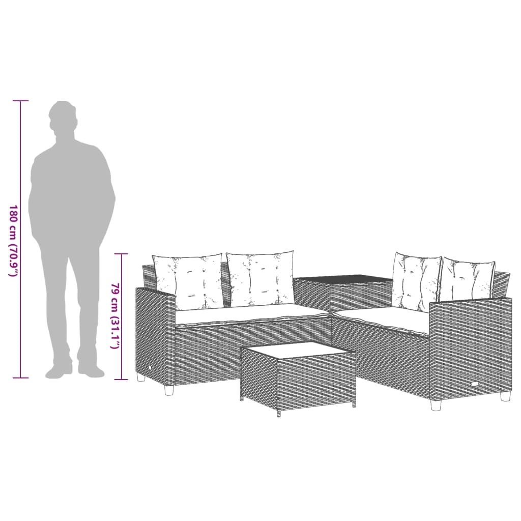 Dieses Gartensofa in L-Form ist die perfekte Ergänzung zu deinem Garten, deiner Terrasse oder deinem Innenhof. Es bietet einen bequemen und einladenden Platz, um mit Familie und Freunden zu plaudern oder dich einfach nur zu entspannen und das Leben im Freien zu genießen. Langlebiges Material: PE-Rattan, auch als Poly Rattan bekannt, ist ein robustes, pflegeleichtes synthetisches Material, das die Optik von natürlichem Rattan aufweist. Es kennzeichnet sich durch ein geringes Eigengewicht und lässt sich einfach reinigen. Aufgrund seiner Haltbarkeit und Witterungsbeständigkeit wird es häufig bei der Herstellung von Gartenmöbeln verwendet.Stauraum mit wasserfestem Innenbeutel: Der Garten-Beistelltisch verfügt über ein Innenfach, das mit einem wasserfesten Beutel zur Aufbewahrung von Kissen, Spielzeug und anderen Gegenständen versehen ist. Die Kissen sind mit Bezügen versehen und lassen sich mittels Klettverschlüssen fest und sicher an den Sofas befestigen.Bequemes Sitzerlebnis: Dieser Gartensessel mit dick gepolsterten Kissen bietet ein angenehmes Sitzgefühl.Abnehmbarer und waschbarer Bezug: Diese Sitzkissen verfügen über abnehmbare Bezüge für einfaches Waschen und Pflegen.Tischplatte aus Glas: Die Tischplatte des Gartentisches besteht aus starkem und langlebigem Hartglas, sodass sie leicht mit einem feuchten Tuch gereinigt werden kann und deinem Außenbereich einen Hauch von Eleganz verleiht. Gut zu wissen:Wir empfehlen dir, deine Gartenmöbel mit einer wasserdichten Hülle zu schützen, um lange Zeit eine ansprechende Optik aufzuweisen.