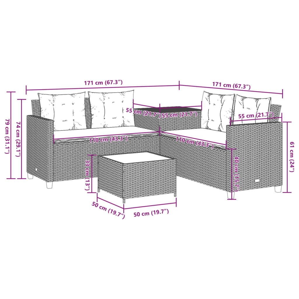 Dieses Gartensofa in L-Form ist die perfekte Ergänzung zu deinem Garten, deiner Terrasse oder deinem Innenhof. Es bietet einen bequemen und einladenden Platz, um mit Familie und Freunden zu plaudern oder dich einfach nur zu entspannen und das Leben im Freien zu genießen. Langlebiges Material: PE-Rattan, auch als Poly Rattan bekannt, ist ein robustes, pflegeleichtes synthetisches Material, das die Optik von natürlichem Rattan aufweist. Es kennzeichnet sich durch ein geringes Eigengewicht und lässt sich einfach reinigen. Aufgrund seiner Haltbarkeit und Witterungsbeständigkeit wird es häufig bei der Herstellung von Gartenmöbeln verwendet.Stauraum mit wasserfestem Innenbeutel: Der Garten-Beistelltisch verfügt über ein Innenfach, das mit einem wasserfesten Beutel zur Aufbewahrung von Kissen, Spielzeug und anderen Gegenständen versehen ist. Die Kissen sind mit Bezügen versehen und lassen sich mittels Klettverschlüssen fest und sicher an den Sofas befestigen.Bequemes Sitzerlebnis: Dieser Gartensessel mit dick gepolsterten Kissen bietet ein angenehmes Sitzgefühl.Abnehmbarer und waschbarer Bezug: Diese Sitzkissen verfügen über abnehmbare Bezüge für einfaches Waschen und Pflegen.Tischplatte aus Glas: Die Tischplatte des Gartentisches besteht aus starkem und langlebigem Hartglas, sodass sie leicht mit einem feuchten Tuch gereinigt werden kann und deinem Außenbereich einen Hauch von Eleganz verleiht. Gut zu wissen:Wir empfehlen dir, deine Gartenmöbel mit einer wasserdichten Hülle zu schützen, um lange Zeit eine ansprechende Optik aufzuweisen.