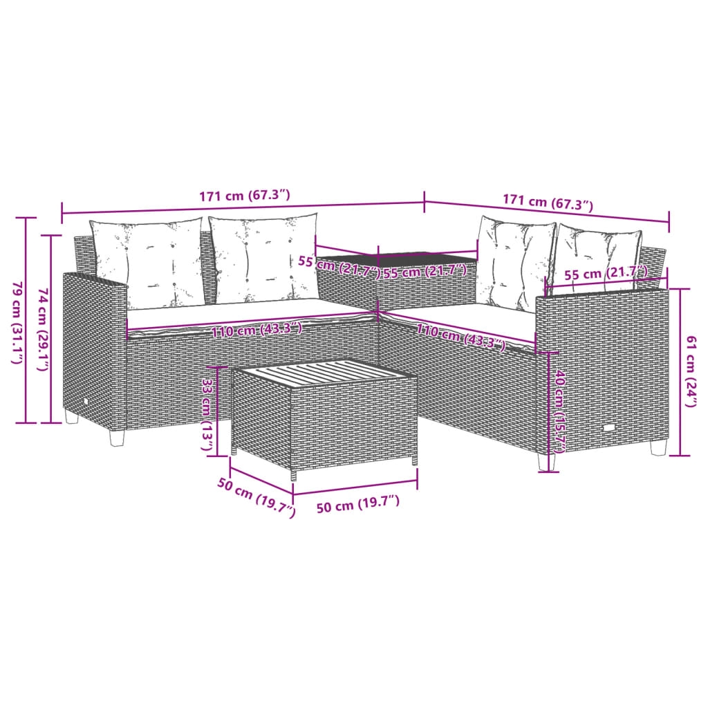 Dieses Gartensofa in L-Form ist die perfekte Ergänzung zu deinem Garten, deiner Terrasse oder deinem Innenhof. Es bietet einen bequemen und einladenden Platz, um mit Familie und Freunden zu plaudern oder dich einfach nur zu entspannen und das Leben im Freien zu genießen. Langlebiges Material: PE-Rattan, auch als Poly Rattan bekannt, ist ein robustes, pflegeleichtes synthetisches Material, das die Optik von natürlichem Rattan aufweist. Es kennzeichnet sich durch ein geringes Eigengewicht und lässt sich einfach reinigen. Aufgrund seiner Haltbarkeit und Witterungsbeständigkeit wird es häufig bei der Herstellung von Gartenmöbeln verwendet.Stauraum mit wasserfestem Innenbeutel: Der Garten-Beistelltisch verfügt über ein Innenfach, das mit einem wasserfesten Beutel zur Aufbewahrung von Kissen, Spielzeug und anderen Gegenständen versehen ist. Die Kissen sind mit Bezügen versehen und lassen sich mittels Klettverschlüssen fest und sicher an den Sofas befestigen.Bequemes Sitzerlebnis: Dieser Gartensessel mit dick gepolsterten Kissen bietet ein angenehmes Sitzgefühl.Abnehmbarer und waschbarer Bezug: Diese Sitzkissen verfügen über abnehmbare Bezüge für einfaches Waschen und Pflegen.Stabile und pflegeleichte Tischplatte: Dieser Gartentisch besitzt eine Tischplatte aus Akazienholz, die robust und langlebig ist und sich leicht mit einem feuchten Tuch reinigen lässt. Gut zu wissen:Wir empfehlen dir, deine Gartenmöbel mit einer wasserdichten Hülle zu schützen, um lange Zeit eine ansprechende Optik aufzuweisen.