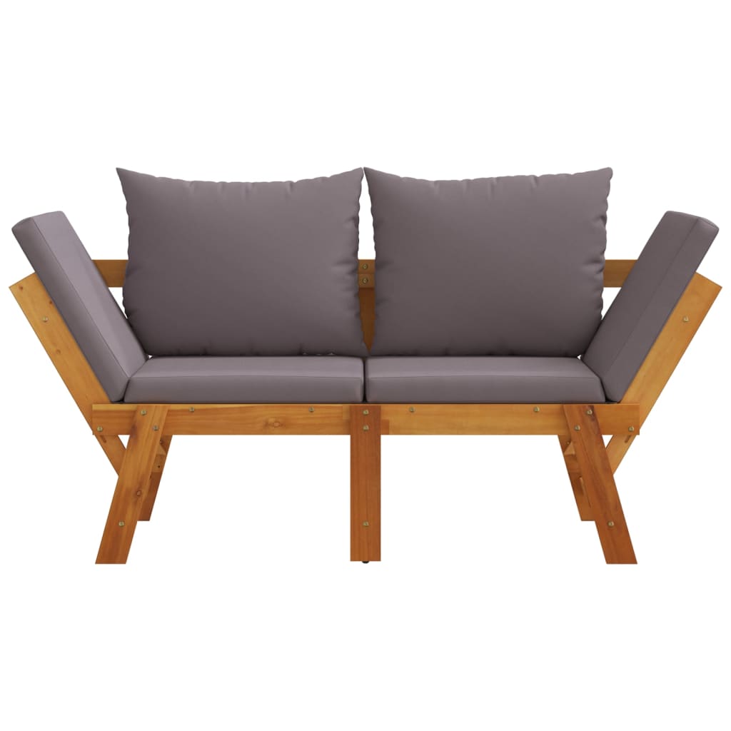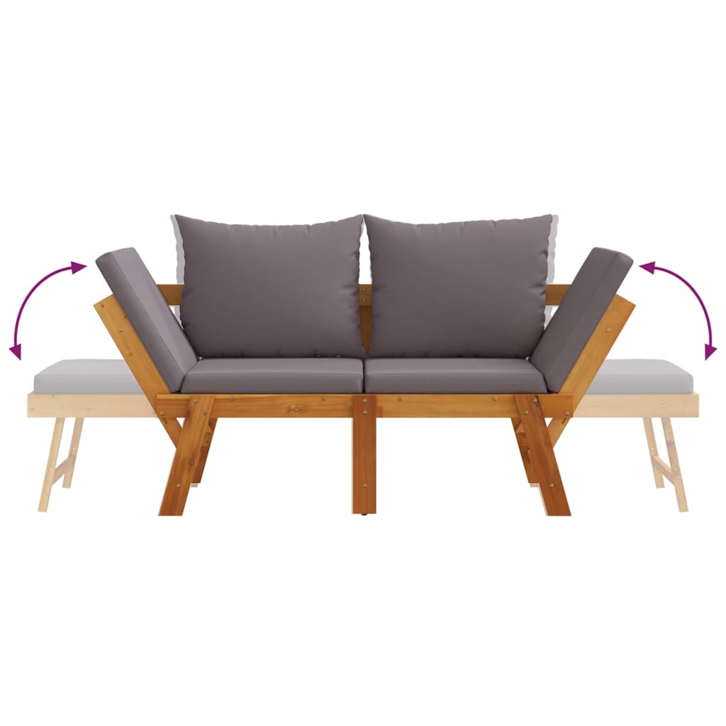 Diese 2-in-1 Gartenbank ist die perfekte Wahl, um dich an einem sonnigen Tag auf deiner Veranda zu entspannen oder dich abends hinzulegen, um die Sterne zu beobachten. Robust und stabil: Massives Akazienholz ist für seine Festigkeit und Haltbarkeit bekannt. Seine vielfältige Farbe und seine einzigartige Maserung verleihen ihm eine attraktive Optik. Dank seiner ausgezeichneten Stabilität und Witterungsbeständigkeit eignet es sich ideal für die Herstellung von Innen- und Außenmöbeln.2-in-1-Design: Die Gartenbank lässt sich dank der verstellbaren Seiten schnell und einfach in ein Tagesbett verwandeln.Bequemes Sitzerlebnis: Dieser Gartensessel mit dick gepolsterten Kissen bietet ein angenehmes Sitzgefühl.Gute Belüftung und Verhinderung von Ansammlungen: Das Latten-Design sorgt für eine optimale Luftzirkulation und verhindert effektiv, dass sich Wasser ansammelt, wodurch die Sitzfläche stets bequem trocken bleibt. Gut zu wissen:Wir empfehlen dir, deine Gartenmöbel mit einer wasserdichten Hülle zu schützen, um lange Zeit eine ansprechende Optik aufzuweisen.