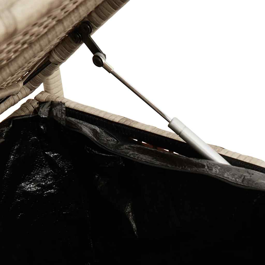 Diese Sitzbank bietet nicht nur eine bequeme Sitzgelegenheit im Außenbereich, sondern eignet sich auch perfekt, um Gartenkissen, Gartengeräte, Handtücher und andere Gegenstände ordentlich und griffbereit aufzubewahren.Langlebiges Material: PE-Rattan, auch als Poly Rattan bekannt, ist ein robustes, pflegeleichtes synthetisches Material, das die Optik von natürlichem Rattan aufweist. Es kennzeichnet sich durch ein geringes Eigengewicht und lässt sich einfach reinigen. Aufgrund seiner Haltbarkeit und Witterungsbeständigkeit wird es häufig bei der Herstellung von Gartenmöbeln verwendet.Stauraum: Der Gartenhocker verfügt über einen Stauraum an der Unterseite, der mit einem wasserfesten Beutel zur Aufbewahrung von Kissen, Spielzeug und anderen Gegenständen ausgestattet ist. Der innere Beutel kann mit Klettverschlüssen sicher am Sitz befestigt werden, was für Stabilität sorgt und Bewegungen verhindert.Sicheres und einfaches Öffnen und Schließen: Die Gasfeder erleichtert das Öffnen des Deckels und verhindert das Einklemmen der Finger.Bequemes Sitzerlebnis: Dieser Gartensessel mit dick gepolsterten Kissen bietet ein angenehmes Sitzgefühl.Abnehmbarer und waschbarer Bezug: Diese Sitzkissen verfügen über abnehmbare Bezüge für einfaches Waschen und Pflegen. Gut zu wissen:Wir empfehlen dir, deine Gartenmöbel mit einer wasserdichten Hülle zu schützen, um lange Zeit eine ansprechende Optik aufzuweisen.
