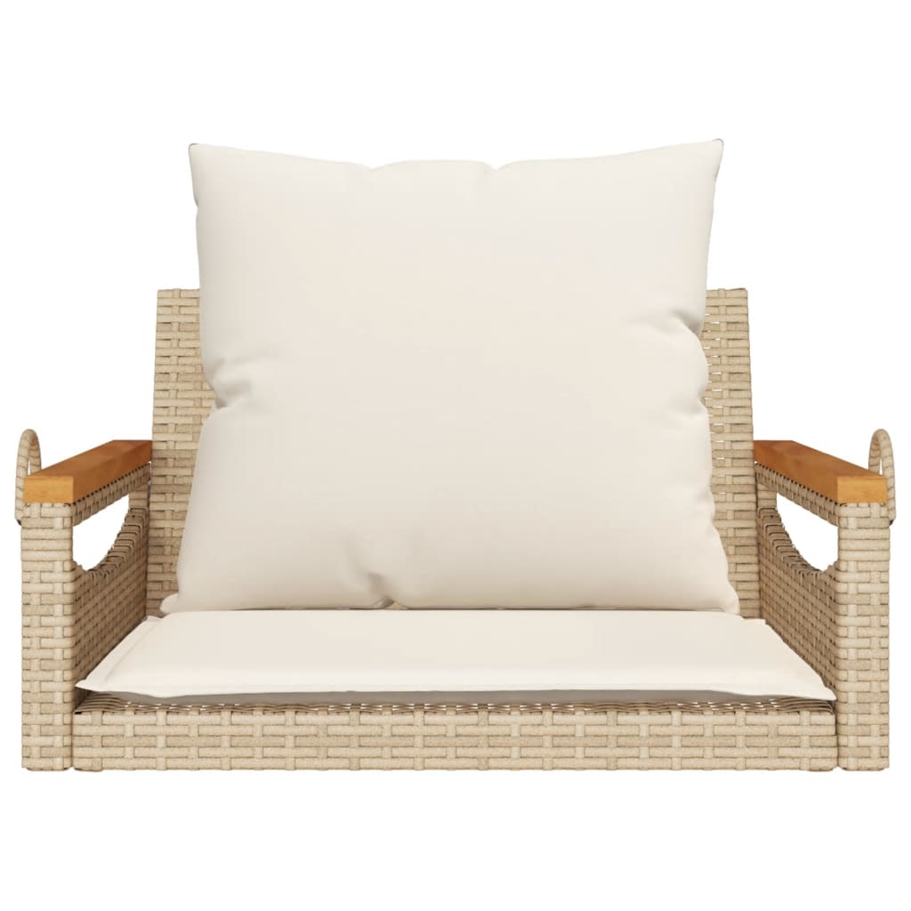 Diese Schaukelbank mit Kissen ist die perfekte Wahl, um dich in deinem Außenbereich zu entspannen. Langlebiges Material: PE-Rattan, auch als Poly Rattan bekannt, ist ein robustes, pflegeleichtes synthetisches Material, das die Optik von natürlichem Rattan aufweist. Es kennzeichnet sich durch ein geringes Eigengewicht und lässt sich einfach reinigen. Aufgrund seiner Haltbarkeit und Witterungsbeständigkeit wird es häufig bei der Herstellung von Gartenmöbeln verwendet.Bequemes Sitzerlebnis: Dieser Gartensessel mit dick gepolsterten Kissen bietet ein angenehmes Sitzgefühl.Schaukelfunktion: Erlebe höchste Entspannung und genieße die sanfte Schaukelbewegung und die Brise auf dieser Hängebank.Praktische Befestigungsringe: Die Hängebank ist mit Befestigungsringen ausgestattet und lässt sich bequem an großen Bäumen, Ständern und anderen stabilen Strukturen aufhängen.Robuster und stabiler Rahmen: Dank des pulverbeschichteten Stahlrahmens ist das Outdoor-Möbel robust, stabil und für den täglichen Einsatz im Außenbereich geeignet. Gut zu wissen:Wir empfehlen dir, deine Gartenmöbel mit einer wasserdichten Hülle zu schützen, um lange Zeit eine ansprechende Optik aufzuweisen.Die Lieferung umfasst nur die Schaukelbank. Das Schaukelgestell und die Aufhängeketten sind nicht inbegriffen.