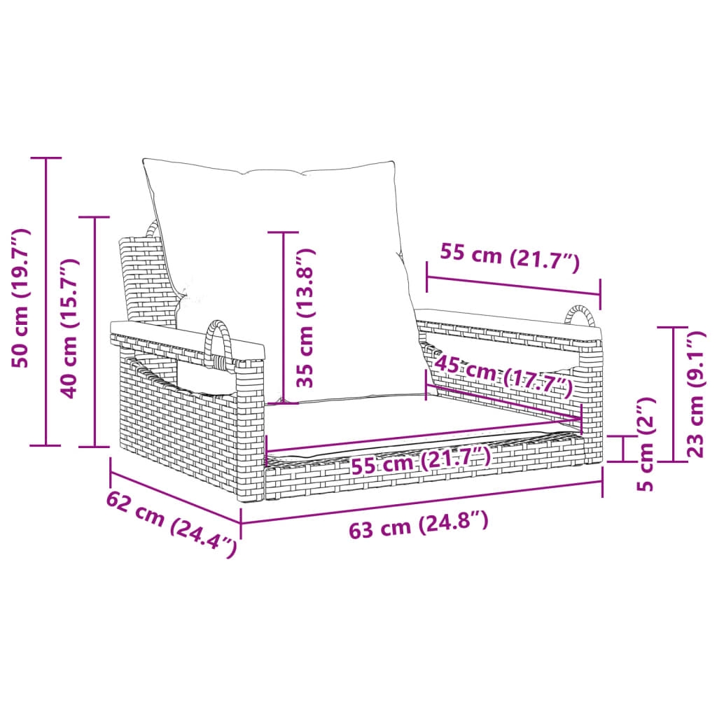 Diese Schaukelbank mit Kissen ist die perfekte Wahl, um dich in deinem Außenbereich zu entspannen. Langlebiges Material: PE-Rattan, auch als Poly Rattan bekannt, ist ein robustes, pflegeleichtes synthetisches Material, das die Optik von natürlichem Rattan aufweist. Es kennzeichnet sich durch ein geringes Eigengewicht und lässt sich einfach reinigen. Aufgrund seiner Haltbarkeit und Witterungsbeständigkeit wird es häufig bei der Herstellung von Gartenmöbeln verwendet.Bequemes Sitzerlebnis: Dieser Gartensessel mit dick gepolsterten Kissen bietet ein angenehmes Sitzgefühl.Schaukelfunktion: Erlebe höchste Entspannung und genieße die sanfte Schaukelbewegung und die Brise auf dieser Hängebank.Praktische Befestigungsringe: Die Hängebank ist mit Befestigungsringen ausgestattet und lässt sich bequem an großen Bäumen, Ständern und anderen stabilen Strukturen aufhängen.Robuster und stabiler Rahmen: Dank des pulverbeschichteten Stahlrahmens ist das Outdoor-Möbel robust, stabil und für den täglichen Einsatz im Außenbereich geeignet. Gut zu wissen:Wir empfehlen dir, deine Gartenmöbel mit einer wasserdichten Hülle zu schützen, um lange Zeit eine ansprechende Optik aufzuweisen.Die Lieferung umfasst nur die Schaukelbank. Das Schaukelgestell und die Aufhängeketten sind nicht inbegriffen.
