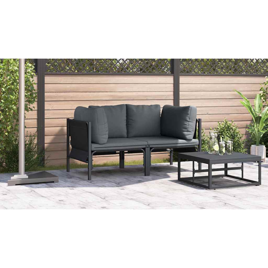 Dieses Outdoor-Sofa-Set hat einen modernen Look mit seinem schlichten Design und den klaren Linien. Es bietet dir eine flexible Sitzgelegenheit für deinen Balkon oder deine Terrasse. Der pulverbeschichtete Finish sorgt für einen schlanken Look, perfekt für jeden Außenbereich. Hier steht Komfort an erster Stelle, ideal zum Chillen allein oder mit Freunden und Familie. Robuster pulverbeschichteter Stahl: Dieses Sofa-Set ist aus pulverbeschichtetem Stahl, der sehr stabil und rostbeständig ist. Perfekt für draußen, es bleibt jahrelang in gutem Zustand und ist eine tolle Investition. Elegante anthrazitfarbene Oberfläche: Mit seiner schönen anthrazit Farbe passt dieses Set super zu deiner Außenausstattung. Der Farbton setzt einen stilvollen Akzent, egal ob du deine Terrasse aufpeppen oder einen gemütlichen Chill-out-Platz auf dem Balkon schaffen möchtest. Bequeme Sitzanordnung: Ideal zum Entspannen oder für gesellige Runden, bietet es viel Platz für verschiedene Sitzkonfigurationen. Du kannst es ganz leicht umstellen, je nach Anlass, von ruhigen Morgen bis zu lebhaften Abenden mit Freunden. UV- und wetterfest: Dieses Produkt ist so gebaut, dass es starkem Sonnenlicht und verschiedenen Wetterbedingungen standhält. Es wird unter der Sonne nicht verblassen oder schwächer werden, sodass du dir weniger Sorgen um Abnutzung machen musst und mehr Zeit hast, es zu genießen. Für einfache Pflege designt: Dieses Sofa-Set sieht einfach toll aus. Einfach abdecken, wenn du es nicht benutzt, damit deine Möbel jahrelang gut aussehen.
