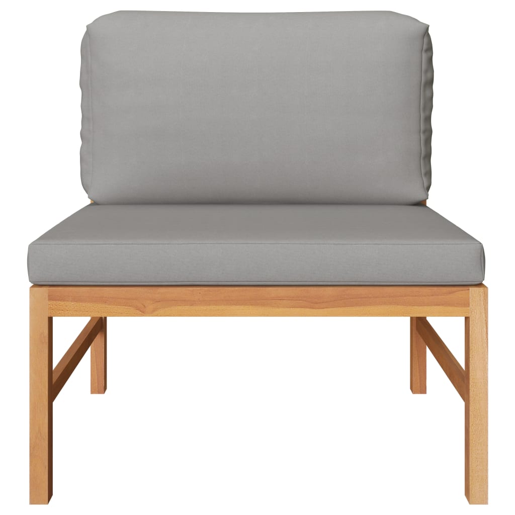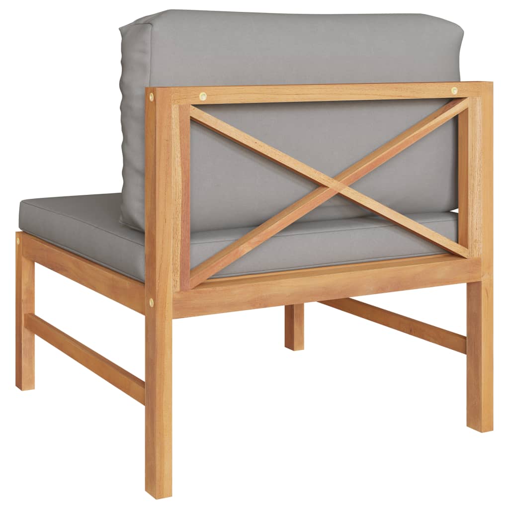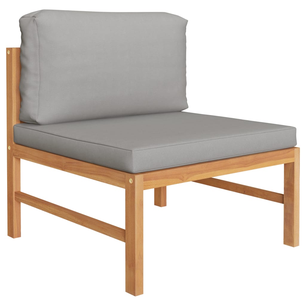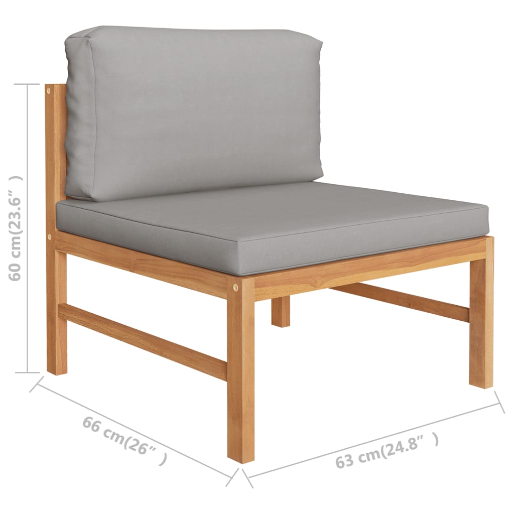 Dieses Sofa-Mittelteil aus Holz, das durch sein elegantes Design und weiche Kissen besticht, wird eine großartige Ergänzung zu Ihrem Garten, Hof oder Ihrer Terrasse darstellen. Es ist der ideale Platz, um mit Familie und Freunden zu plaudern oder einfach nur das Wetter zu genießen. Das für dieses Möbelstück verwendete Teak-Hartholz ist technisch getrocknet und anschließend fein geschliffen worden, um ein sehr glattes Erscheinungsbild zu erhalten. Teakholz wird für seine außergewöhnliche Festigkeit und Witterungsbeständigkeit geschätzt und eignet sich daher weitaus besser für Gartenmöbel als jede andere Holzart. Es ist die perfekte Wahl, wenn Sie sich ein langlebiges Gartenmöbelstück anschaffen möchten. Die dick gepolsterten Sitz- und Rückenkissen tragen zu hohem Sitzkomfort bei. Die geschliffene Oberfläche lässt sich leicht mit einem feuchten Tuch reinigen. Das Gartensofa ist flexibel und einfach zu umstellen und kann daher problemlos an jede Umgebung angepasst werden, um alle Ihre Anforderungen zu erfüllen.