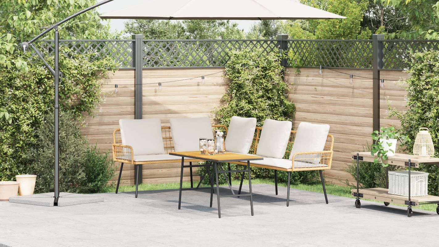 Geniee die Zeit drauen mit diesem coolen Rattan-Sofa-Set, das einen passenden Tisch hat. Es bietet Platz fr bis zu fnf Personen und ist der perfekte Ort zum Entspannen oder um sich mit Freunden zu treffen. Das starke, UV-bestndige Rattan sieht bei jedem Wetter super aus. Es ist einfach zu pflegen und kommt mit weichen Polyesterkissen, auf denen du stundenlang relaxen kannst. Egal, ob du eine gesellige Runde machst oder einen ruhigen Abend genieen mchtest, dieses Set schafft die richtige Atmosphre. Sein modernes Design passt zu jedem Auenbereich und verleiht deinem Raum einen Hauch von Eleganz.