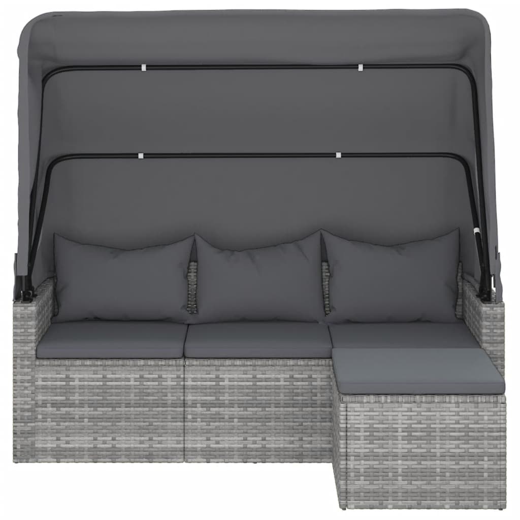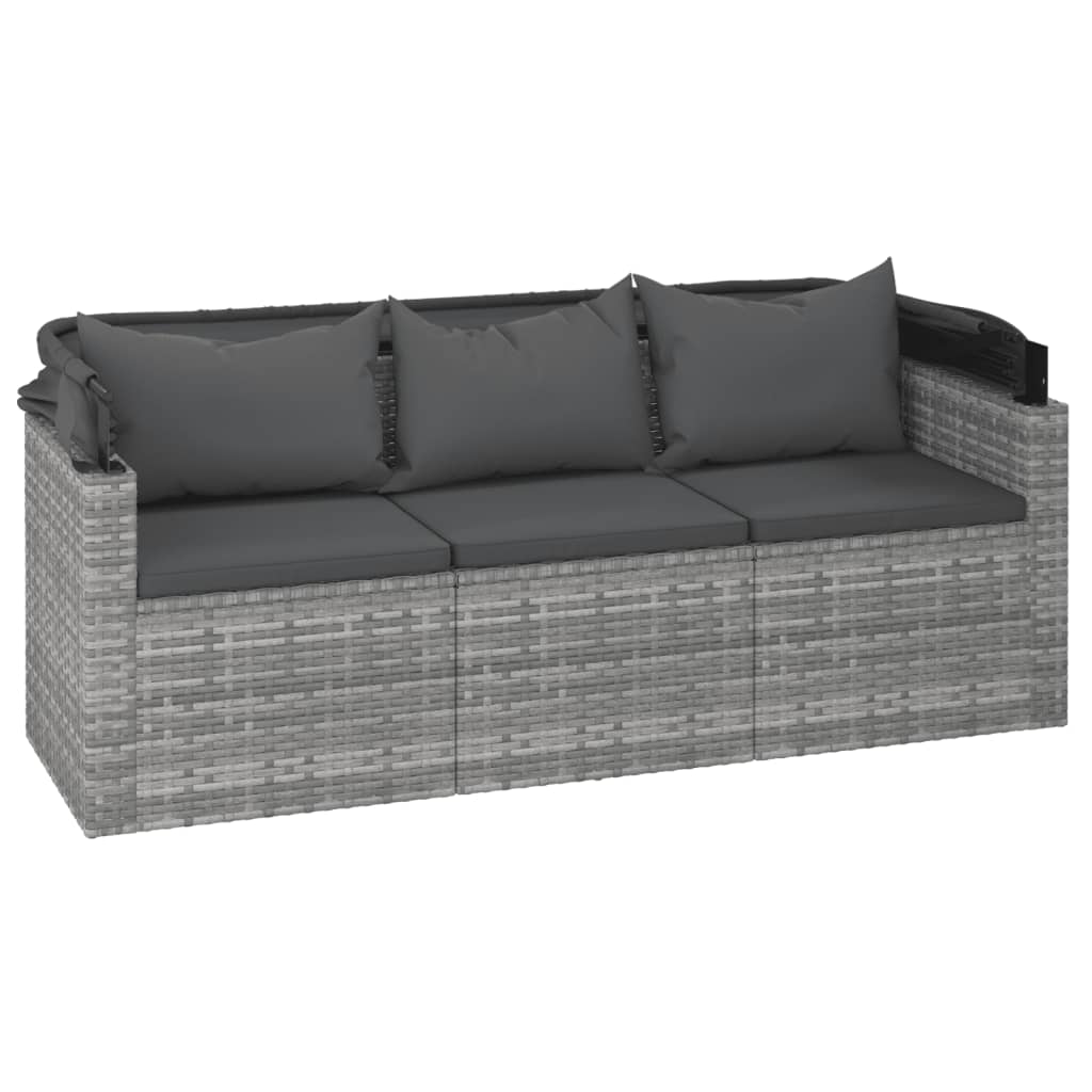Dieses bequeme 3-Sitzer-Gartensofa mit Dach und Fußhocker ist eine perfekte Kombination aus Stil und Funktionalität. Langlebiges Material: PE-Rattan, auch als Poly Rattan bekannt, ist witterungsbeständig und pflegeleicht. Seine Oberfläche weist lange Zeit eine ansprechende Optik auf. Es ist kostengünstiger als andere Materialien und bietet gleichzeitig hohe Qualität, Komfort und einen ästhetisches Look.Faltbares Dach: Das Dach lässt sich einfach an deine Bedürfnisse anpassen. Öffne das Dach, um Sonnenlicht zu genießen, und schließe es, um dich im Schatten zu entspannen. Es blockiert wirksam schädliche UV-Strahlen und schützt empfindliche Haut vor Sonnenbrand.Robust: Die pulverbeschichtete Stahlrahmen sorgen für Robustheit und Stabilität.Praktischer Fußhocker: Der Hocker bietet Platz zum Ausruhen der Füße beim Liegen auf dem Sofa, kann aber auch als zusätzliche Sitzgelegenheit dienen.Bequemes Sitzerlebnis: Mit dick gepolsterten Sitz- und Rückenkissen versehen, ist das Gartensofa sehr bequem. Gut zu wissen:Um die Montage so einfach wie möglich zu machen, wird jedes Produkt mit einer Anleitung geliefert. Hinweis:Damit deine Gartenmöbel lange schön bleiben, empfehlen wir dir, sie mit einer wasserdichten Hülle zu schützen.