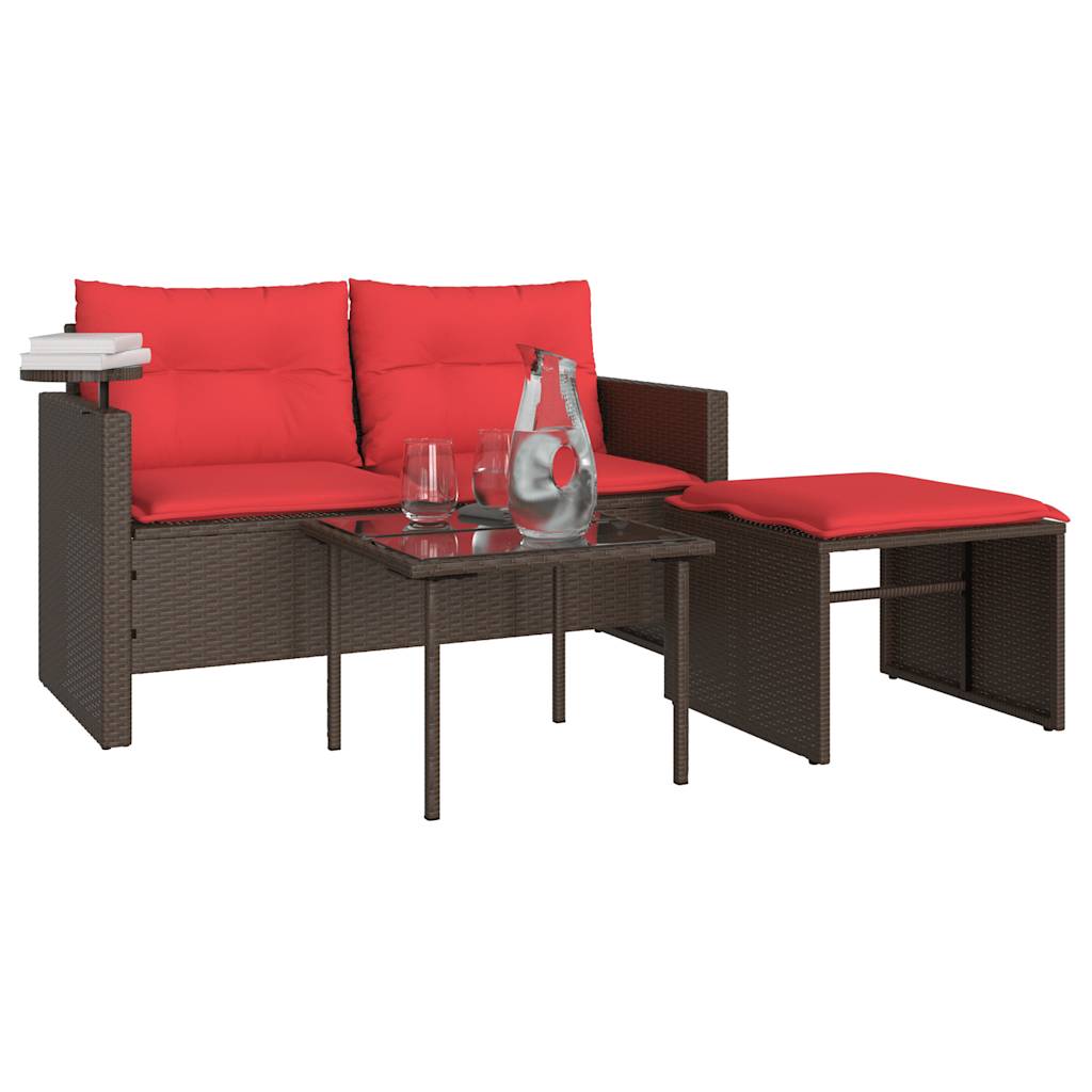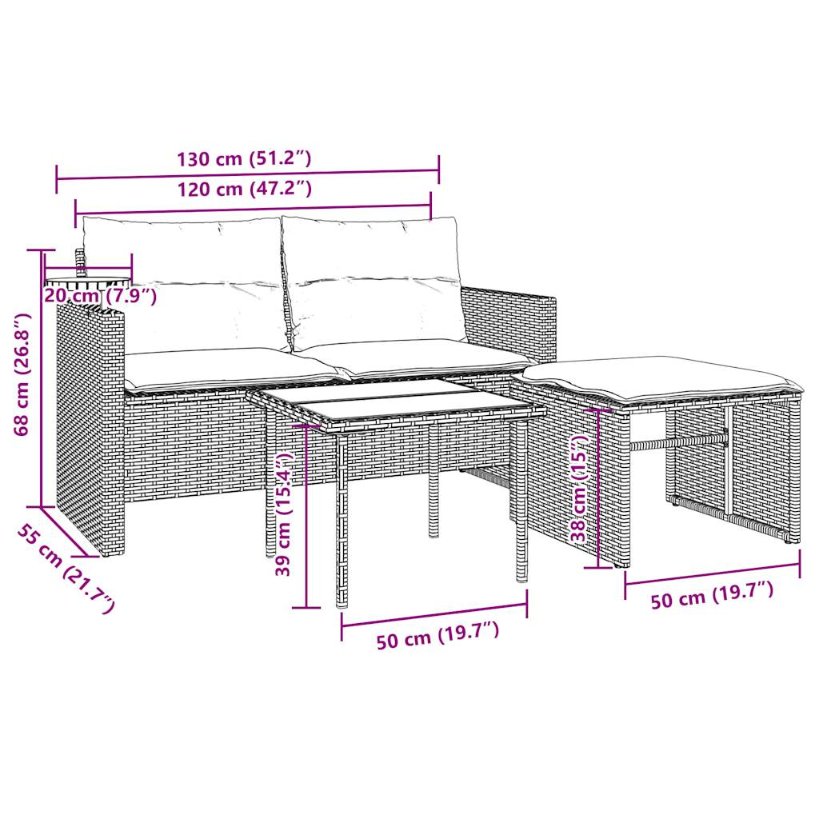 Dieses Gartensofa-Set ist die perfekte Ergänzung für Ihren Garten, Ihre Terrasse oder Ihren Innenhof und bietet einen komfortablen und einladenden Platz zum Plaudern mit Familie und Freunden oder einfach zum Entspannen und Genießen der Natur. Langlebiges Material: PE-Rattan, auch bekannt als Polyrattan, ist ein starkes, pflegeleichtes synthetisches Material, das wie natürliches Rattan aussieht. Es ist leicht, einfach zu reinigen und wird aufgrund seiner Langlebigkeit und Wetterbeständigkeit häufig für Gartenmöbel verwendet.Bequemes Sitzerlebnis: Dieses Gartenmöbel mit dick gepolsterten Kissen bietet ein bequemes Sitzerlebnis.Praktischer Beistelltisch: Dieses Gartenmöbel verfügt über einen höhenverstellbaren Beistelltisch an der Armlehne, an dem Sie Ihre wichtigsten Dinge bequem in Reichweite aufbewahren können.Abnehmbarer und waschbarer Bezug: Diese Sitzkissen verfügen über abnehmbare Bezüge für einfaches Waschen und Pflegen.Glastischplatte: Die Tischplatte des Gartentisches besteht aus robustem und langlebigem Hartglas, sodass sie sich leicht mit einem feuchten Tuch reinigen lässt und Ihrem Außenbereich einen Hauch von Eleganz verleiht. Gut zu wissen:Damit Ihre Gartenmöbel lange schön bleiben, empfehlen wir Ihnen, sie mit einer wasserdichten Abdeckung zu schützen.