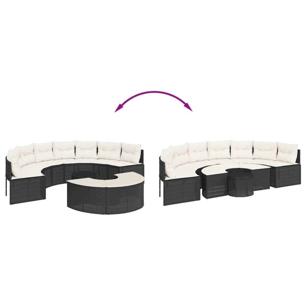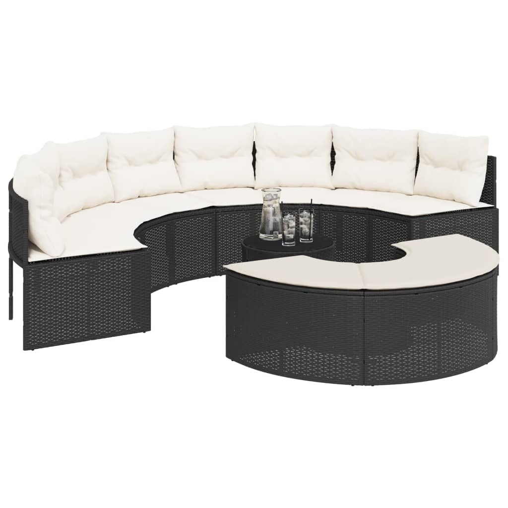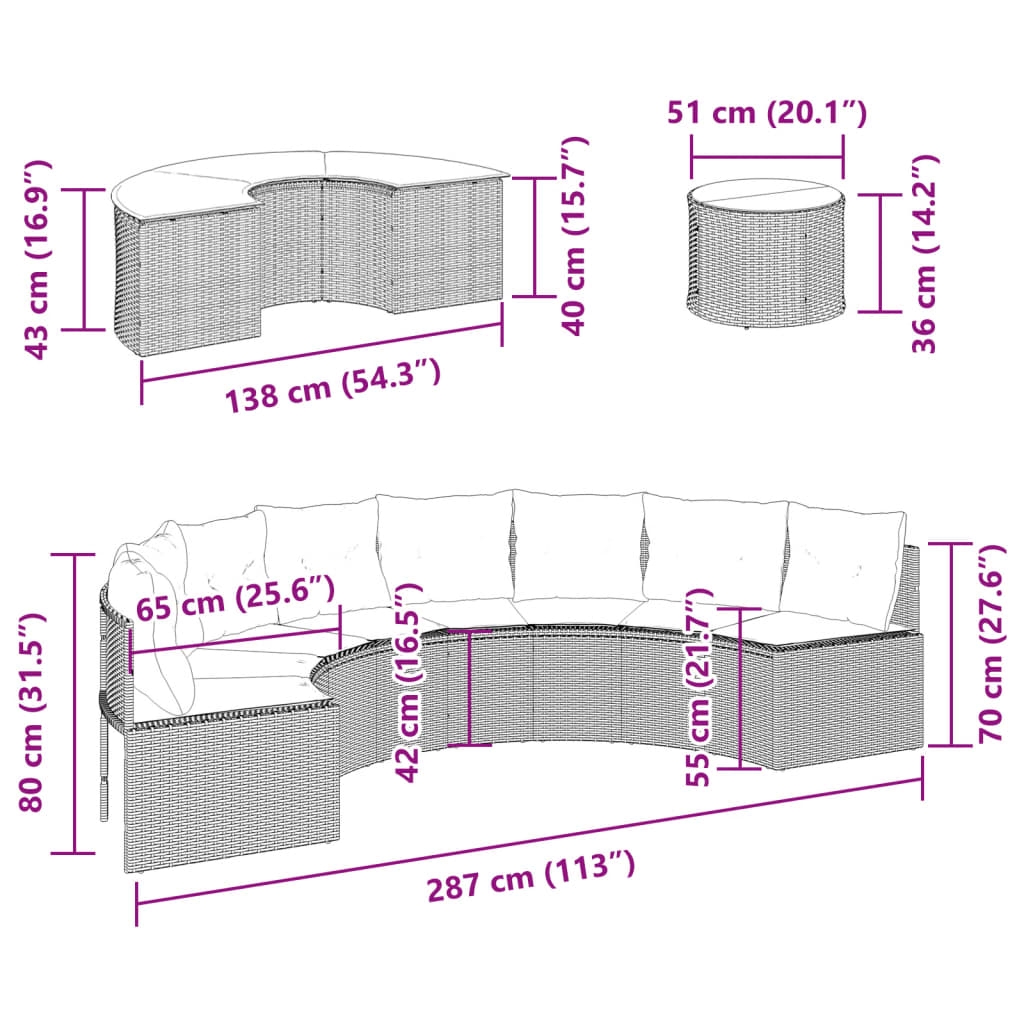 Dieses Gartensofa-Set in halbrundem Design ist die perfekte Ergänzung zu deinem Garten, deiner Terrasse oder deinem Innenhof. Es bietet einen bequemen und einladenden Platz, um mit Familie und Freunden zu plaudern oder einfach nur zu entspannen und das Leben im Freien zu genießen. Langlebiges Material: PE-Rattan, auch als Poly Rattan bekannt, ist ein robustes, pflegeleichtes synthetisches Material, das die Optik von natürlichem Rattan aufweist. Es kennzeichnet sich durch ein geringes Eigengewicht und lässt sich einfach reinigen. Aufgrund seiner Haltbarkeit und Witterungsbeständigkeit wird es häufig bei der Herstellung von Gartenmöbeln verwendet.Bequemes Sitzerlebnis: Dieser Gartensessel mit dick gepolsterten Kissen bietet ein angenehmes Sitzgefühl.Abnehmbarer und waschbarer Bezug: Diese Sitzkissen verfügen über abnehmbare Bezüge für einfaches Waschen und Pflegen.Tischplatte aus Glas: Die Tischplatte des Gartentisches besteht aus starkem und langlebigem Hartglas, sodass sie leicht mit einem feuchten Tuch gereinigt werden kann und deinem Außenbereich einen Hauch von Eleganz verleiht.Vielseitiger Fußhocker: Der Hocker ist vielseitig einsetzbar und dient als bequeme Fußstütze beim Entspannen auf dem Sofa oder als zusätzlicher Sitzplatz in deinem Garten. Gut zu wissen:Wir empfehlen dir, deine Gartenmöbel mit einer wasserdichten Hülle zu schützen, um lange Zeit eine ansprechende Optik aufzuweisen.