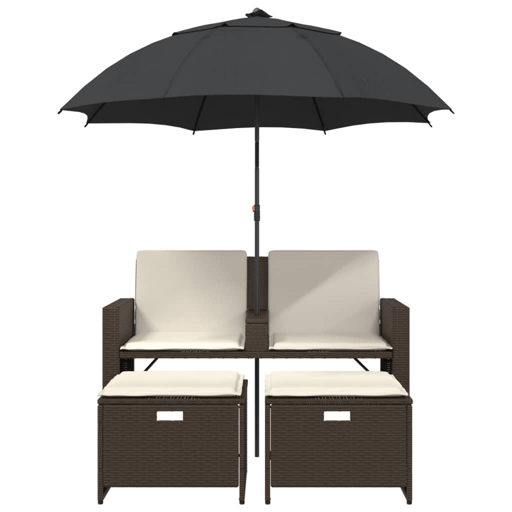 Dieses Outdoor-Sofa mit Sonnenschirm und Hockern ist die perfekte Ergänzung zu deinem Garten, deiner Terrasse oder deinem Innenhof. Er bietet einen bequemen und einladenden Platz, um mit Familie und Freunden zu plaudern oder einfach nur zu relaxen und das Leben im Außenbereich zu genießen. Langlebiges Material: PE-Rattan, auch als Poly Rattan bekannt, ist ein robustes, pflegeleichtes synthetisches Material, das die Optik von natürlichem Rattan aufweist. Es kennzeichnet sich durch ein geringes Eigengewicht und lässt sich einfach reinigen. Aufgrund seiner Haltbarkeit und Witterungsbeständigkeit wird es häufig bei der Herstellung von Gartenmöbeln verwendet.Praktischer Sonnenschirm: Das Gartensofa verfügt über einen Sonnenschirm mit Kippmechanismus, der sich einfach verstellen lässt, um in jedem Winkel Schatten und Schutz vor der Sonne zu bieten.Abnehmbarer und waschbarer Bezug: Diese Kissen haben abnehmbare Bezüge für einfache Reinigung und Pflege.Kompakte Aufbewahrung: Die Fußhocker können platzsparend unter den Sitzen verstaut werden.Robuster und stabiler Rahmen: Dank des pulverbeschichteten Stahlrahmens ist das Möbelstück robust, stabil und für den täglichen Einsatz im Außenbereich geeignet. Gut zu wissen:Wir empfehlen dir, deine Gartenmöbel mit einer wasserdichten Hülle zu schützen, um lange Zeit eine ansprechende Optik aufzuweisen.