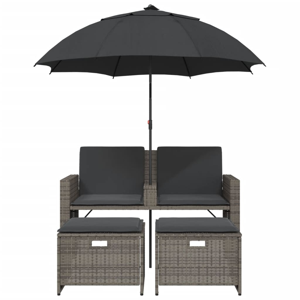 Dieses Outdoor-Sofa mit Sonnenschirm und Hockern ist die perfekte Ergänzung zu deinem Garten, deiner Terrasse oder deinem Innenhof. Er bietet einen bequemen und einladenden Platz, um mit Familie und Freunden zu plaudern oder einfach nur zu relaxen und das Leben im Außenbereich zu genießen. Langlebiges Material: PE-Rattan, auch als Poly Rattan bekannt, ist ein robustes, pflegeleichtes synthetisches Material, das die Optik von natürlichem Rattan aufweist. Es kennzeichnet sich durch ein geringes Eigengewicht und lässt sich einfach reinigen. Aufgrund seiner Haltbarkeit und Witterungsbeständigkeit wird es häufig bei der Herstellung von Gartenmöbeln verwendet.Praktischer Sonnenschirm: Das Gartensofa verfügt über einen Sonnenschirm mit Kippmechanismus, der sich einfach verstellen lässt, um in jedem Winkel Schatten und Schutz vor der Sonne zu bieten.Abnehmbarer und waschbarer Bezug: Diese Kissen haben abnehmbare Bezüge für einfache Reinigung und Pflege.Kompakte Aufbewahrung: Die Fußhocker können platzsparend unter den Sitzen verstaut werden.Robuster und stabiler Rahmen: Dank des pulverbeschichteten Stahlrahmens ist das Möbelstück robust, stabil und für den täglichen Einsatz im Außenbereich geeignet. Gut zu wissen:Wir empfehlen dir, deine Gartenmöbel mit einer wasserdichten Hülle zu schützen, um lange Zeit eine ansprechende Optik aufzuweisen.