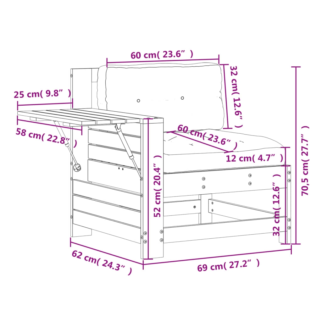 Dieses Gartensofa aus Holz mit Kissen ist eine großartige Ergänzung für deinen Garten, deine Terrasse oder deinen Innenhof. Auf diesem Gartenmöbel kannst du mit Familie und Freunden plaudern oder einfach nur das Wetter genießen. Massives Kiefernholz: Der Gartensessel ist aus massivem Kiefernholz gefertigt, was ihm Robustheit und Stabilität verleiht. Massives Kiefernholz ist ein wunderschönes Naturmaterial. Kiefernholz weist eine gerade Maserung auf und die Aststellen verleihen dem Material seine charakteristische, rustikale Optik.Bequemes Sitzerlebnis: Die Rückenlehne und die Kissen bieten höchsten Sitzkomfort.Praktischer Beistelltisch: Dieses Gartensofa verfügt über klappbare Ablagen mit Gasfedern an den Armlehnen, auf denen du verschieden Sachen griffbereit aufbewahren kannst.Latten-Design: Das Latten-Design verhindert die Ansammlung von Wasser auf dem Gartenstuhl, hält die Sitzfläche trocken und verhindert Verrottung.Modulares Design: Das modulare Sofa lässt sich flexibel und einfach umstellen. Du kannst es mit anderen modularen Sofa-Elementen kombinieren, die im Dropdown-Menü zur Auswahl stehen, um dein persönliches Outdoor-Lounge-Set nach Belieben zu erstellen!Breite Anwendungen: Die Gartensessel eignet sich perfekt für jede Veranda, Terrasse, jeden Hinterhof, Rasen, Garten, usw. Gut zu wissen:Wir empfehlen dir, deine Gartenmöbel mit einer wasserdichten Hülle zu schützen, um lange Zeit eine ansprechende Optik aufzuweisen.