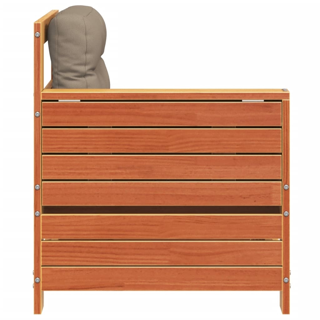 Dieses Gartensofa aus Holz mit Kissen ist eine großartige Ergänzung für deinen Garten, deine Terrasse oder deinen Innenhof. Auf diesem Gartenmöbel kannst du mit Familie und Freunden plaudern oder einfach nur das Wetter genießen. Massives Kiefernholz: Der Gartensessel ist aus massivem Kiefernholz gefertigt, was ihm Robustheit und Stabilität verleiht. Massives Kiefernholz ist ein wunderschönes Naturmaterial. Kiefernholz weist eine gerade Maserung auf und die Aststellen verleihen dem Material seine charakteristische, rustikale Optik.Bequemes Sitzerlebnis: Die Rückenlehne und die Kissen bieten höchsten Sitzkomfort.Praktischer Beistelltisch: Dieses Gartensofa verfügt über klappbare Ablagen mit Gasfedern an den Armlehnen, auf denen du verschieden Sachen griffbereit aufbewahren kannst.Latten-Design: Das Latten-Design verhindert die Ansammlung von Wasser auf dem Gartenstuhl, hält die Sitzfläche trocken und verhindert Verrottung.Modulares Design: Das modulare Sofa lässt sich flexibel und einfach umstellen. Du kannst es mit anderen modularen Sofa-Elementen kombinieren, die im Dropdown-Menü zur Auswahl stehen, um dein persönliches Outdoor-Lounge-Set nach Belieben zu erstellen!Breite Anwendungen: Die Gartensessel eignet sich perfekt für jede Veranda, Terrasse, jeden Hinterhof, Rasen, Garten, usw. Gut zu wissen:Wir empfehlen dir, deine Gartenmöbel mit einer wasserdichten Hülle zu schützen, um lange Zeit eine ansprechende Optik aufzuweisen.
