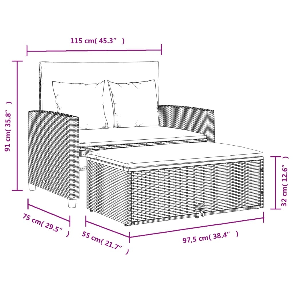 Entspanne dich und genieße die Natur auf diesem bequemen 2-Sitzer-Gartensofa! Langlebiges Material: PE-Rattan, auch als Poly Rattan bekannt, ist ein robustes, pflegeleichtes synthetisches Material, das die Optik von natürlichem Rattan aufweist. Es kennzeichnet sich durch ein geringes Eigengewicht und lässt sich einfach reinigen. Aufgrund seiner Haltbarkeit und Witterungsbeständigkeit wird es häufig bei der Herstellung von Gartenmöbeln verwendet. Vielseitig einsetzbar: Dieses Möbelstück lässt sich sowohl als 2-Sitzer-Bank als auch als Schlafsofa einsetzen. Du kannst es durch Zurückneigen der Rückenlehne und Herausziehen des Hockers von unter der Bank ganz einfach in ein Bett verwandeln. Die Stützplatten hinder den Rückenlehnen erhöhen die Stabilität des Bettes. Vielseitiger Hocker: Der Outdoor-Hocker lässt sich als Sitzgelegenheit oder Fußhocker verwenden, kann aber auch als Couchtisch für Getränke, Snacks oder Dekorationen dienen. Darüber hinaus ist der Hocker mit einem Staufach versehen, sodass sich Kissen und Auflagen platzsparend unter dem Sofa verstauen lassen. Bequemes Sitzerlebnis: Dieser Gartensessel mit dick gepolsterten Kissen bietet ein angenehmes Sitzgefühl. Abnehmbarer und waschbarer Bezug: Diese Sitzkissen verfügen über abnehmbare Bezüge für einfaches Waschen und Pflegen. Gut zu wissen:Wir empfehlen dir, deine Gartenmöbel mit einer wasserdichten Hülle zu schützen, um lange Zeit eine ansprechende Optik aufzuweisen.
