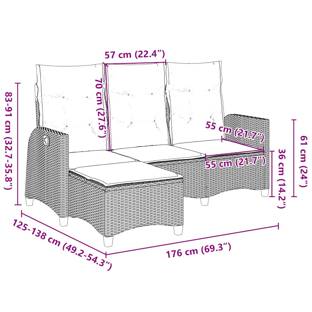 Entspanne dich und genieße die Natur auf diesem bequemen und verstellbaren Gartensofa! Langlebiges Material: PE-Rattan, auch als Poly Rattan bekannt, ist ein robustes, pflegeleichtes synthetisches Material, das die Optik von natürlichem Rattan aufweist. Es kennzeichnet sich durch ein geringes Eigengewicht und lässt sich einfach reinigen. Aufgrund seiner Haltbarkeit und Witterungsbeständigkeit wird es häufig bei der Herstellung von Gartenmöbeln verwendet.Verstellbare Rückenlehne: Diese Gartenmöbel haben einen Griff an jedem Sitz. So kannst du die Rückenlehne durch Ziehen des Griffes verstellen und sie danach schnell wieder in ihre ursprüngliche Position bringen.Bequemes Sitzerlebnis: Dieser Gartensessel mit dick gepolsterten Kissen bietet ein angenehmes Sitzgefühl.Abnehmbarer und waschbarer Bezug: Die Sitzkissen verfügen über abnehmbare Bezüge, die sich ganz einfach waschen und reinigen lassen. Dank der Klappen an der Rückseite können die Rückenkissen ganz einfach an den Rückenlehnen befestigt werden.Robuster und stabiler Rahmen: Dank des pulverbeschichteten Stahlrahmens ist das Möbelstück robust, stabil und für den täglichen Einsatz im Außenbereich geeignet. Gut zu wissen:Wir empfehlen dir, deine Gartenmöbel mit einer wasserdichten Hülle zu schützen, um lange Zeit eine ansprechende Optik aufzuweisen.