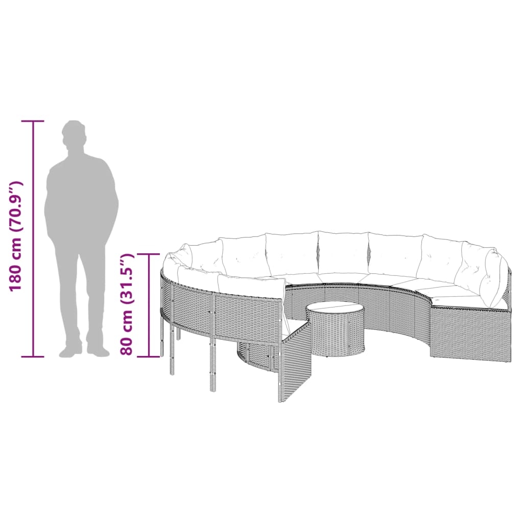 Dieses runde Gartensofa ist die perfekte Ergänzung zu deinem Garten, deiner Terrasse oder deinem Innenhof. Es bietet einen bequemen und einladenden Platz, um mit Familie und Freunden zu plaudern oder dich einfach nur zu entspannen und das Leben im Freien zu genießen. Langlebiges Material: PE-Rattan, auch als Poly Rattan bekannt, ist ein robustes, pflegeleichtes synthetisches Material, das die Optik von natürlichem Rattan aufweist. Es kennzeichnet sich durch ein geringes Eigengewicht und lässt sich einfach reinigen. Aufgrund seiner Haltbarkeit und Witterungsbeständigkeit wird es häufig bei der Herstellung von Gartenmöbeln verwendet.Bequemes Sitzerlebnis: Dieser Gartensessel mit dick gepolsterten Kissen bietet ein angenehmes Sitzgefühl.Abnehmbarer und waschbarer Bezug: Diese Sitzkissen verfügen über abnehmbare Bezüge für einfaches Waschen und Pflegen.Tischplatte aus Glas: Die Tischplatte des Gartentisches besteht aus starkem und langlebigem Hartglas, sodass sie leicht mit einem feuchten Tuch gereinigt werden kann und deinem Außenbereich einen Hauch von Eleganz verleiht.Robuster und stabiler Rahmen: Dank des pulverbeschichteten Stahlrahmens ist das Möbelstück robust, stabil und für den täglichen Einsatz im Außenbereich geeignet. Gut zu wissen:Wir empfehlen dir, deine Gartenmöbel mit einer wasserdichten Hülle zu schützen, um lange Zeit eine ansprechende Optik aufzuweisen.