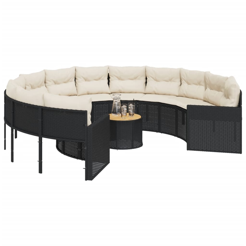 Dieses runde Gartensofa ist die perfekte Ergänzung zu deinem Garten, deiner Terrasse oder deinem Innenhof. Es bietet einen bequemen und einladenden Platz, um mit Familie und Freunden zu plaudern oder dich einfach nur zu entspannen und das Leben im Freien zu genießen. Langlebiges Material: PE-Rattan, auch als Poly Rattan bekannt, ist ein robustes, pflegeleichtes synthetisches Material, das die Optik von natürlichem Rattan aufweist. Es kennzeichnet sich durch ein geringes Eigengewicht und lässt sich einfach reinigen. Aufgrund seiner Haltbarkeit und Witterungsbeständigkeit wird es häufig bei der Herstellung von Gartenmöbeln verwendet.Bequemes Sitzerlebnis: Dieser Gartensessel mit dick gepolsterten Kissen bietet ein angenehmes Sitzgefühl.Abnehmbarer und waschbarer Bezug: Diese Sitzkissen verfügen über abnehmbare Bezüge für einfaches Waschen und Pflegen.Stabile und pflegeleichte Tischplatte: Dieser Gartentisch besitzt eine Tischplatte aus Akazienholz, die robust und langlebig ist und sich leicht mit einem feuchten Tuch reinigen lässt.Robuster und stabiler Rahmen: Dank des pulverbeschichteten Stahlrahmens ist das Möbelstück robust, stabil und für den täglichen Einsatz im Außenbereich geeignet. Gut zu wissen:Wir empfehlen dir, deine Gartenmöbel mit einer wasserdichten Hülle zu schützen, um lange Zeit eine ansprechende Optik aufzuweisen.