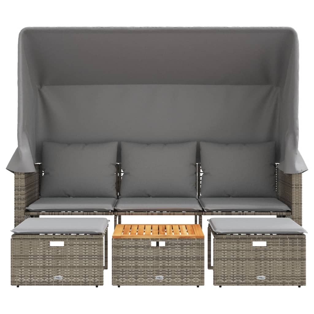 Dieses Gartensofa mit Dach und Hockern ist die perfekte Ergänzung zu deinem Garten, Hinterhof oder deiner Terrasse. Es bietet einen bequemen und einladenden Platz für Gespräche mit Familie und Freunden oder einfach nur zum Entspannen und Genießen der Natur. Langlebiges Material: PE-Rattan, auch als Poly Rattan bekannt, ist ein robustes, pflegeleichtes synthetisches Material, das die Optik von natürlichem Rattan aufweist. Es kennzeichnet sich durch ein geringes Eigengewicht und lässt sich einfach reinigen. Aufgrund seiner Haltbarkeit und Witterungsbeständigkeit wird es häufig bei der Herstellung von Gartenmöbeln verwendet.Ausziehbares Sonnendach: Dank der ausziehbaren Sonnendaches genießt du den ganzen Tag über ein kühles und angenehmes Plätzchen in deinem Außenbereich.Stabile und pflegeleichte Tischplatte: Dieser Gartentisch besitzt eine Tischplatte aus Akazienholz, die robust und langlebig ist und sich leicht mit einem feuchten Tuch reinigen lässt.Abnehmbarer und waschbarer Bezug: Diese Sitzkissen verfügen über abnehmbare Bezüge für einfaches Waschen und Pflegen.Kompakte Aufbewahrung: Die Fußhocker und der Tisch können platzsparend unter dem Gartensofa verstaut werden. Gut zu wissen:Wir empfehlen dir, deine Gartenmöbel mit einer wasserdichten Hülle zu schützen, um lange Zeit eine ansprechende Optik aufzuweisen.