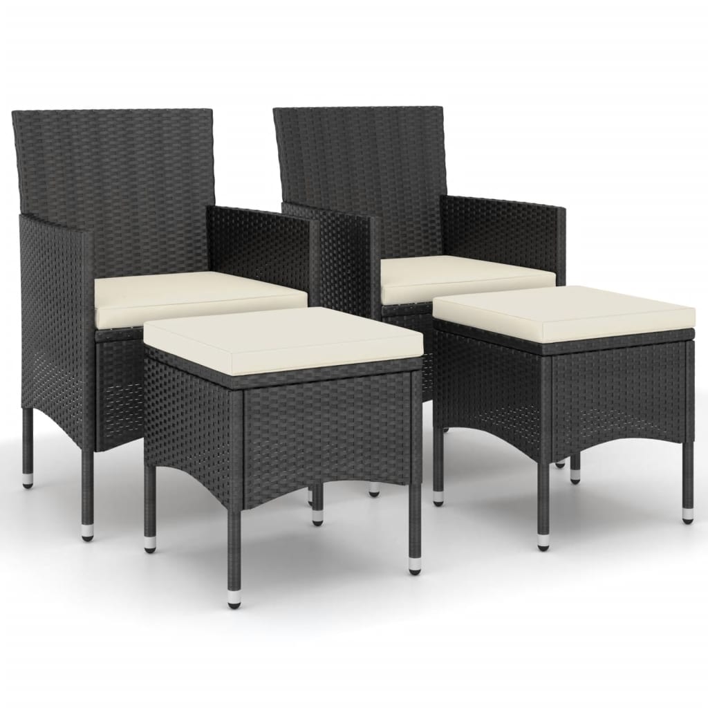 Dieses 4-teilige Gartenstuhl- und Hocker-Set stellt eine perfekte Ergänzung zu Ihrem Garten, Ihrer Terrasse bzw. Ihrem Outdoor-Wohnbereich dar. Die Gartenmöbel bestehen aus einem starken, pulverbeschichteten Stahlrahmen, der sie robust und stabil für jahrelange Entspannung macht. Das mit PE-Rattan bespannte Set aus Stuhl und Hocker für den Außenbereich ist leicht mit einem feuchten Tuch zu reinigen und für den täglichen Gebrauch im Freien geeignet. Außerdem sorgt das dick gepolsterte Sitzkissen für zusätzlichen Sitzkomfort auf dem Stuhl. Hinweis: Um die Lebensdauer Ihrer Gartenmöbel zu verlängern, empfehlen wir Ihnen, diese regelmäßig zu reinigen und bei Nichtgebrauch im Freien abzudecken.Reinigung: Verwenden Sie eine milde Seifenlösung.Lagerung: Wenn möglich, an einem kühlen, trockenen Ort im Innenbereich lagern. Wenn das Produkt im Freien gelagert wird, schützen Sie es mit einer wasserdichten Abdeckung. Wischen und trocknen Sie das überschüssige Wasser oder den Schnee nach Regen oder Schneefall von der ebenen Fläche. Sorgen Sie für eine ausreichende Luftzirkulation, um feuchtigkeitsbedingte Schäden zu vermeiden.