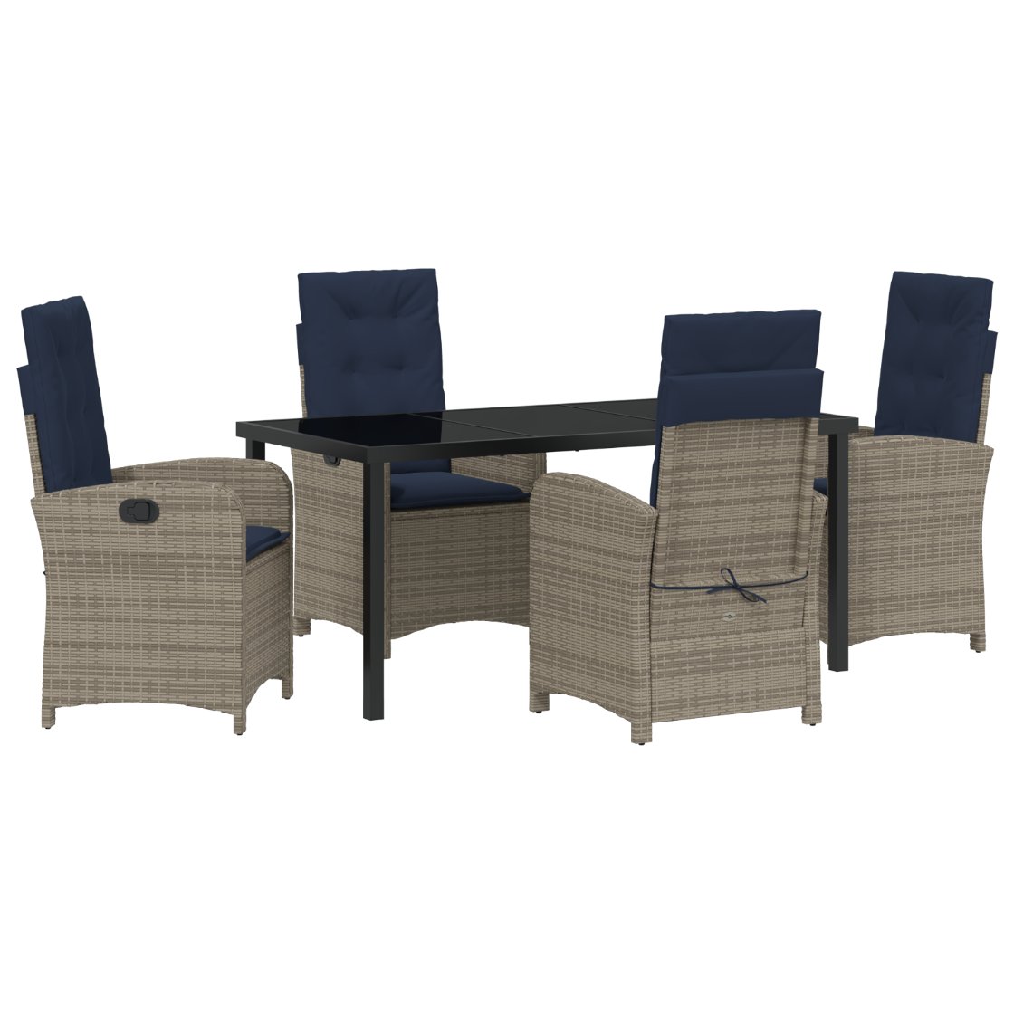 Dieses schicke Set mit zwei verstellbaren Gartenstühlen will deinen Outdoor-Spaß aufpeppen. Es hat ein stylisches graues Poly-Rattan-Geflecht und trendige marineblaue Kissen. Sie sind die perfekte Mischung aus Style und Komfort, also super für jeden Balkon, Patio oder Garten. Robustes Material: Aus PE-Rattan gemacht, hält dieses Material den Witterungsbedingungen stand und ist leicht zu reinigen, sieht dabei aber aus wie das echte Zeug. Verstellbare Rückenlehne: Du kannst die Rückenlehne einfach mit einem praktischen Hebel auf verschiedene Liegepositionen umstellen, so findet jeder seinen perfekten Entspannungswinkel. Gemütliches Sitzerlebnis: Dicke Kissen sorgen für hohen Komfort, und die abnehmbaren Bezüge machen die Reinigung ein Kinderspiel. Robuster Rahmen: Mit einem stabilen pulverbeschichteten Stahlrahmen sind diese Stühle für die Ewigkeit gemacht, damit du lange Freude daran hast. Einfache Pflege: Dank der abnehmbaren Kissenbezüge mit Reißverschlüssen ist die Pflege deiner Stühle einfach; nimm es leicht und genieße sie ohne Sorgen.