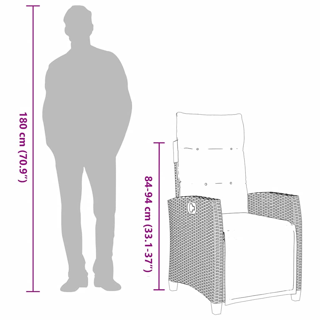 Entspanne dich und genieße die Natur in diesem bequemen Gartenstuhl! Langlebiges Material: PE-Rattan, auch als Poly Rattan bekannt, ist ein robustes, pflegeleichtes synthetisches Material, das die Optik von natürlichem Rattan aufweist. Es kennzeichnet sich durch ein geringes Eigengewicht und lässt sich einfach reinigen. Aufgrund seiner Haltbarkeit und Witterungsbeständigkeit wird es häufig bei der Herstellung von Gartenmöbeln verwendet.Verstellbare Rückenlehne und Fußstütze: Der Gartensessel ist mit einem Griff versehen. So kannst du die Rückenlehne und den Fußteil durch Ziehen des Griffs verstellen und sie danach schnell wieder in ihre ursprüngliche Position bringen.Praktischer Beistelltisch: Dieses Gartensofa verfügt über eine klappbare Ablage mit Gasfedern an der Armlehne, auf der du verschieden Sachen griffbereit aufbewahren kannst.Bequemes Sitzerlebnis: Dieser Gartensessel mit dick gepolsterten Kissen bietet ein angenehmes Sitzgefühl.Abnehmbarer und waschbarer Bezug: Das Sitzkissen verfügt über einen abnehmbaren Bezug, der sich ganz einfach waschen und pflegen lässt. Dank der Klappe an der Rückseite kann das Rückenkissen ganz einfach an der Rückenlehne befestigt werden. Gut zu wissen:Wir empfehlen dir, deine Gartenmöbel mit einer wasserdichten Hülle zu schützen, um lange Zeit eine ansprechende Optik aufzuweisen.