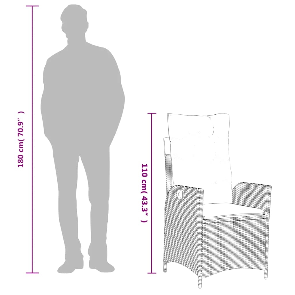 Entspanne dich und genieße die Natur in diesem bequemen Gartenstuhl! Langlebiges Material: PE-Rattan, auch als Poly Rattan bekannt, ist ein robustes, pflegeleichtes synthetisches Material, das die Optik von natürlichem Rattan aufweist. Es kennzeichnet sich durch ein geringes Eigengewicht und lässt sich einfach reinigen. Aufgrund seiner Haltbarkeit und Witterungsbeständigkeit wird es häufig bei der Herstellung von Gartenmöbeln verwendet.Verstellbare Rückenlehne: Dieser Gartensessel ist mit einem Griff an der rechten Seite versehen. So kannst du die Rückenlehne durch Ziehen des Griffs in jede beliebige Position bringen. Die Rückenlehne lässt sich über den Griff auch schnell wieder in die ursprüngliche Position bringen.Bequemes Sitzerlebnis: Dieser Gartensessel mit dick gepolsterten Kissen bietet ein angenehmes Sitzgefühl.Abnehmbarer und waschbarer Bezug: Diese Sitzkissen verfügen über abnehmbare Bezüge für einfaches Waschen und Pflegen.Robuster und stabiler Rahmen: Dank des pulverbeschichteten Stahlrahmens ist das Outdoor-Möbel robust, stabil und für den täglichen Einsatz im Außenbereich geeignet. Gut zu wissen:Wir empfehlen dir, deine Gartenmöbel mit einer wasserdichten Hülle zu schützen, um lange Zeit eine ansprechende Optik aufzuweisen.