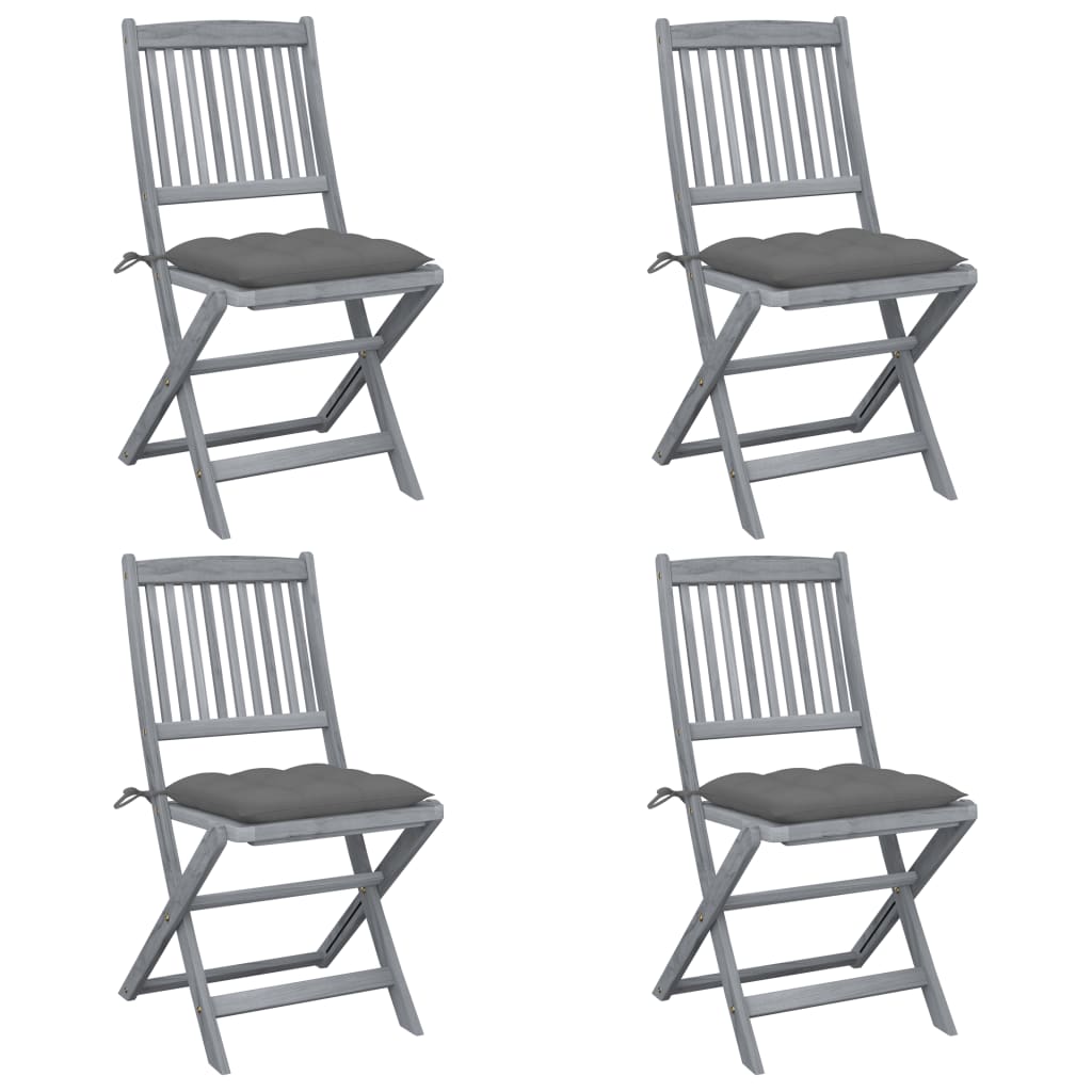 Dieses moderne Set aus Holz-Gartenstühlen mit Sitzpolstern verleiht Ihrem Garten, Ihrer Terrasse oder Ihrem Hof einen Hauch von natürlichem Stil und ist außerdem eine ausgezeichnete Wahl für Mahlzeiten im Freien. Diese Essstühle bestehen aus massivem Akazienholz, einem tropischen Hartholz, was die Stühle witterungsbeständig macht und eine jahrelange Lebensdauer gewährleistet, da massives Akazienholz sowohl belastbar als auch verschleißfest ist. Die grau lasierte Oberfläche ist ganz einfach mit einem feuchten Tuch zu reinigen. Bei Nichtgebrauch lassen sich die Stühle platzsparend zusammenklappen. Darüber hinaus bieten die mitgelieferten Sitzkissen zusätzlichen Komfort beim Entspannen oder Speisen. Zur sicheren Befestigung am Stuhl ist jedes Sitzpolster mit je zwei Bindebändern an zwei Ecken versehen.