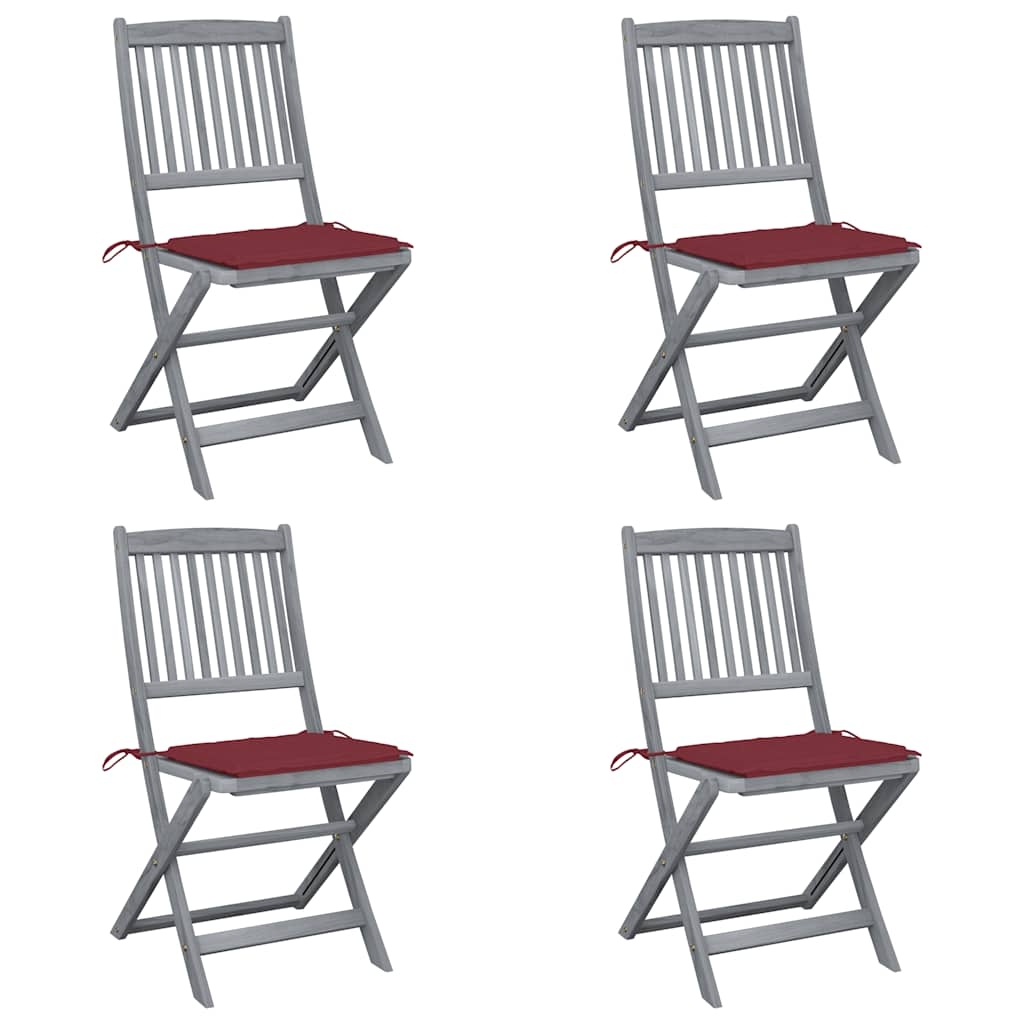 Dieses moderne Set aus Holz-Gartenstühlen mit Sitzpolstern verleiht Ihrem Garten, Ihrer Terrasse oder Ihrem Hof einen Hauch von natürlichem Stil und ist außerdem eine ausgezeichnete Wahl für Mahlzeiten im Freien. Diese Essstühle bestehen aus massivem Akazienholz, einem tropischen Hartholz, was die Stühle witterungsbeständig macht und eine jahrelange Lebensdauer gewährleistet, da massives Akazienholz sowohl belastbar als auch verschleißfest ist. Die grau lasierte Oberfläche ist ganz einfach mit einem feuchten Tuch zu reinigen. Bei Nichtgebrauch lassen sich die Stühle platzsparend zusammenklappen. Darüber hinaus bieten die mitgelieferten Sitzkissen zusätzlichen Komfort beim Entspannen oder Speisen. Zur sicheren Befestigung am Stuhl ist jedes Sitzpolster mit je zwei Bindebändern an zwei Ecken versehen.