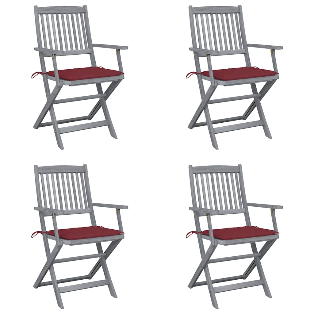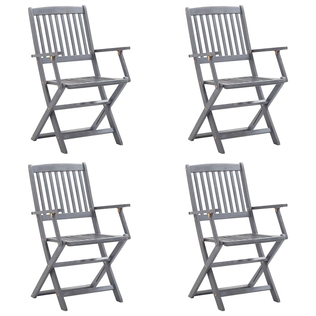 Dieses moderne Set aus Holz-Gartenstühlen mit Sitzpolstern verleiht Ihrem Garten, Ihrer Terrasse oder Ihrem Hof einen Hauch von natürlichem Stil und ist außerdem eine ausgezeichnete Wahl für Mahlzeiten im Freien. Diese Essstühle bestehen aus massivem Akazienholz, einem tropischen Hartholz, was die Stühle witterungsbeständig macht und eine jahrelange Lebensdauer gewährleistet, da massives Akazienholz sowohl belastbar als auch verschleißfest ist. Die grau lasierte Oberfläche ist ganz einfach mit einem feuchten Tuch zu reinigen. Bei Nichtgebrauch lassen sich die Stühle platzsparend zusammenklappen. Darüber hinaus bieten die mitgelieferten Sitzkissen zusätzlichen Komfort beim Entspannen oder Speisen. Zur sicheren Befestigung am Stuhl ist jedes Sitzpolster mit je zwei Bindebändern an zwei Ecken versehen.