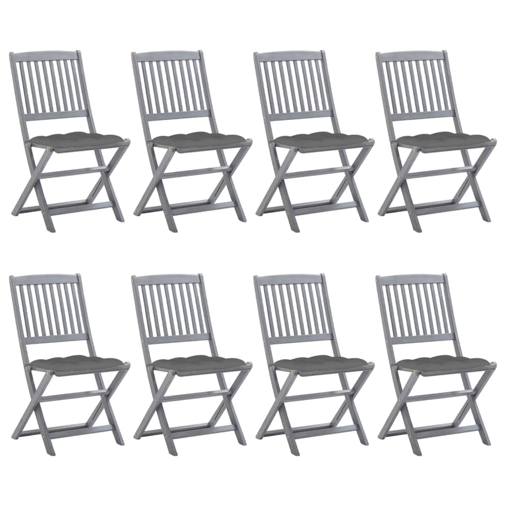 Dieses moderne Set aus Holz-Gartenstühlen mit Sitzpolstern verleiht Ihrem Garten, Ihrer Terrasse oder Ihrem Hof einen Hauch von natürlichem Stil und ist außerdem eine ausgezeichnete Wahl für Mahlzeiten im Freien. Diese Essstühle bestehen aus massivem Akazienholz, einem tropischen Hartholz, was die Stühle witterungsbeständig macht und eine jahrelange Lebensdauer gewährleistet, da massives Akazienholz sowohl belastbar als auch verschleißfest ist. Die grau lasierte Oberfläche ist ganz einfach mit einem feuchten Tuch zu reinigen. Bei Nichtgebrauch lassen sich die Stühle platzsparend zusammenklappen. Darüber hinaus bieten die mitgelieferten Sitzkissen zusätzlichen Komfort beim Entspannen oder Speisen. Zur sicheren Befestigung am Stuhl ist jedes Sitzpolster mit je zwei Bindebändern an zwei Ecken versehen. Hinweis: Um die Lebensdauer Ihrer Gartenmöbel zu verlängern, empfehlen wir Ihnen, diese regelmäßig zu reinigen und im Freien vor Niederschlägen oder starken Sonnenstrahlen zu schützen.Reinigung: Verwenden Sie eine milde SeifenlösungLagerung: Wenn möglich, an einem kühlen, trockenen Ort im Innenbereich lagern. Wenn das Produkt im Freien gelagert wird, schützen Sie es mit einer wasserdichten Abdeckung. Wischen und trocknen Sie das überschüssige Wasser oder den Schnee nach Regen oder Schneefall von ebenen Flächen. Sorgen Sie für eine ausreichende Luftzirkulation, um feuchtigkeitsbedingte Schäden zu vermeiden.